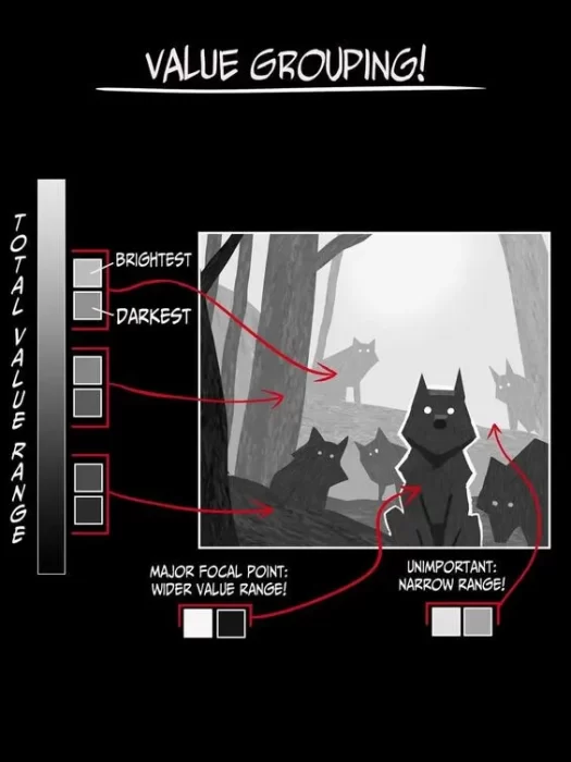 色调键也是考虑的一个有用工具。这是一种指南,提供了关于画面、帧、插图将被描绘的范围的信息。这个工具在游戏照明工作中特别有用,可以帮助你在故事的正确时刻实现所需的氛围。