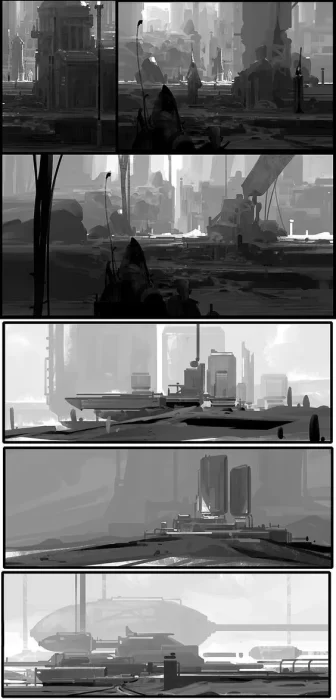 以下是一些概念艺术家草图中包含高色调和低色调的例子。高色调在以浅色为主的图片中可见,而低色调则在以深色为主的图片中展示。