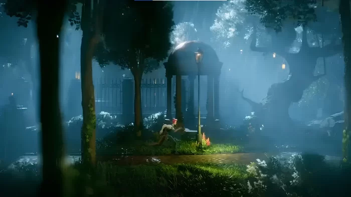 在第四张截图中,一棵倾斜的树和一个附近的人物似乎将玩家的视线引向画面右侧,那里有一个有趣的物体,即一栋孤独的建筑,它在所有其他事物中脱颖而出。这里的光线有助于很好地分隔平面,突出地点的规模,并确保一切不会融合成一个连续的整体。主建筑后面的废弃城市特别被浓雾覆盖,以突出它和主要角色,以及这个地点中也存在的其他物体。
