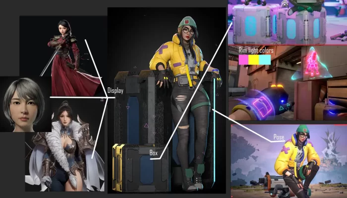 经过漫长的制作过程,我们终于进入了最后一个阶段,很快就要说再见了!在这里,我开始决定如何展示Killjoy。和往常一样,我查找一些我非常欣赏的渲染效果的参考资料。我想要Killjoy有一个准确的姿势和照明设置来贴合她的角色形象,所以我决定查看Killjoy的预告片和概念图,看看什么颜色方案会很出彩,以及我想要她摆出什么样的姿势。对于姿势,我查看了游戏截图或插图来捕捉我想要她表现出的感觉。我决定为她选择一个放松、自鸣得意、稍微开心一点的氛围。
