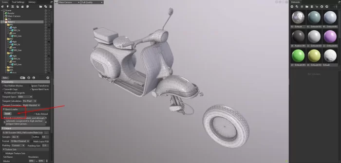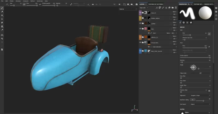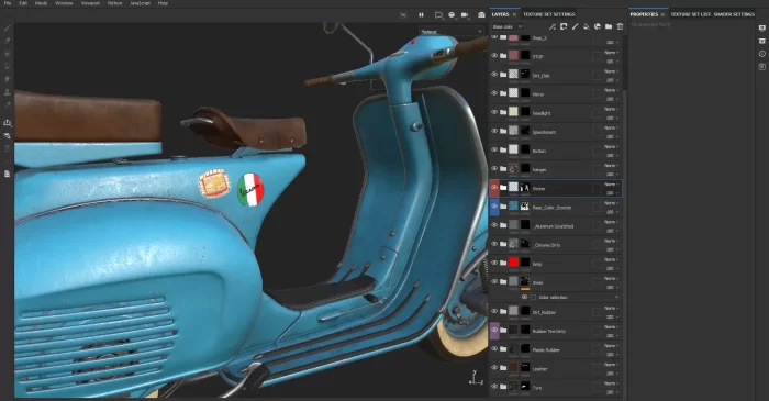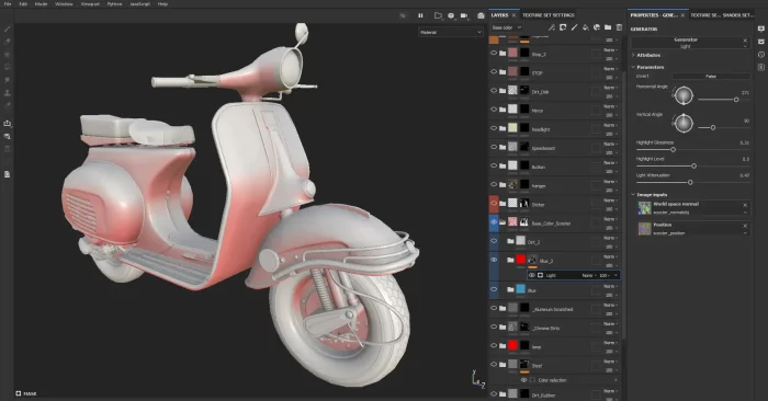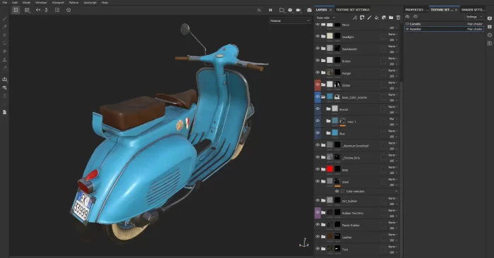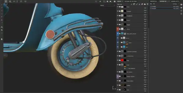 烘焙完成后,我们进入Substance Painter。我分别为踏板车和挎斗绘制纹理。将来在Blender中,我再把它们组合在一起。