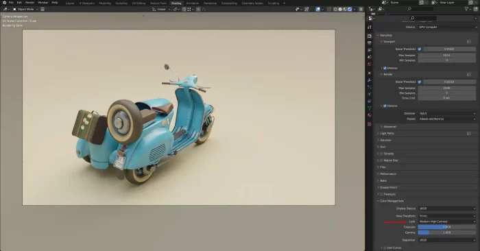 我使用了Cycles渲染引擎。我几乎使用了标准设置。唯一的区别是在色彩管理参数中,我选择了Medium High Contrast配置文件以获得更饱和的画面。但我稍后会在Photoshop中调整这个。