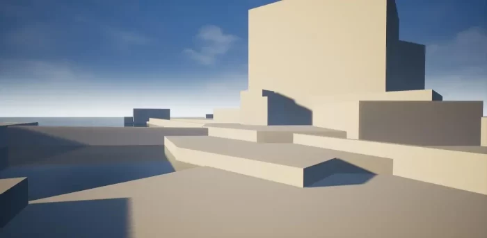 首先,我需要构思并粗略搭建出场景的基本构想。这是我为整个场景设计的第一版灰盒布局概念,旨在确定场景的整体形状语言,同时提前规划整体构图以及主要光源方向至关重要。如果不尽早明确这些要点,你可能会发现自己陷入反复修改而无法确定最终方案,尤其是在时间有限的情况下。