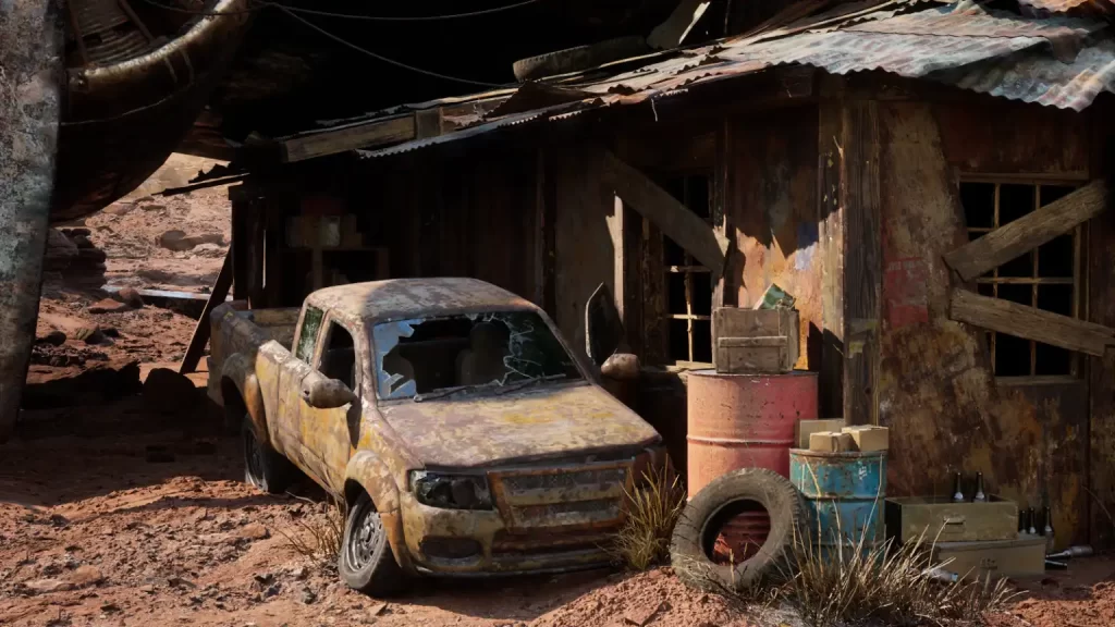 例如,皮卡车有非常简单的低多边形建模,在场景中一开始看起来完全不搭,所以我使用它自己的纹理在我的定制材质层上创建了一个全新的外观,使其与其它所有东西更加协调。