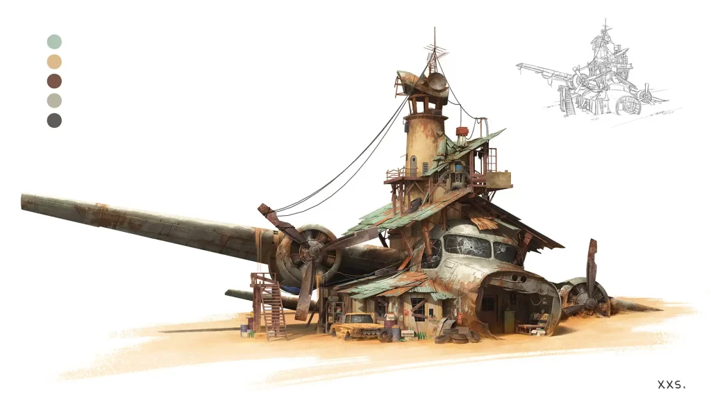 最初,我很难找到一幅真正想要改编的概念艺术作品,但当我看到Michael Xu的艺术作品时,我知道那就是我想要创造的场景。我首先需要确认这一点,所以我收集了一些图片,并与同行讨论。我选择这幅作品,因为它包含了我在寻找的所有元素:独特的创意、室外场景、出色的构图,最重要的是,它看起来重建起来会非常有趣。某人发现一架坠毁的飞机并围绕它建造堡垒的想法真的吸引了我,或者这可能是坠机的幸存者?