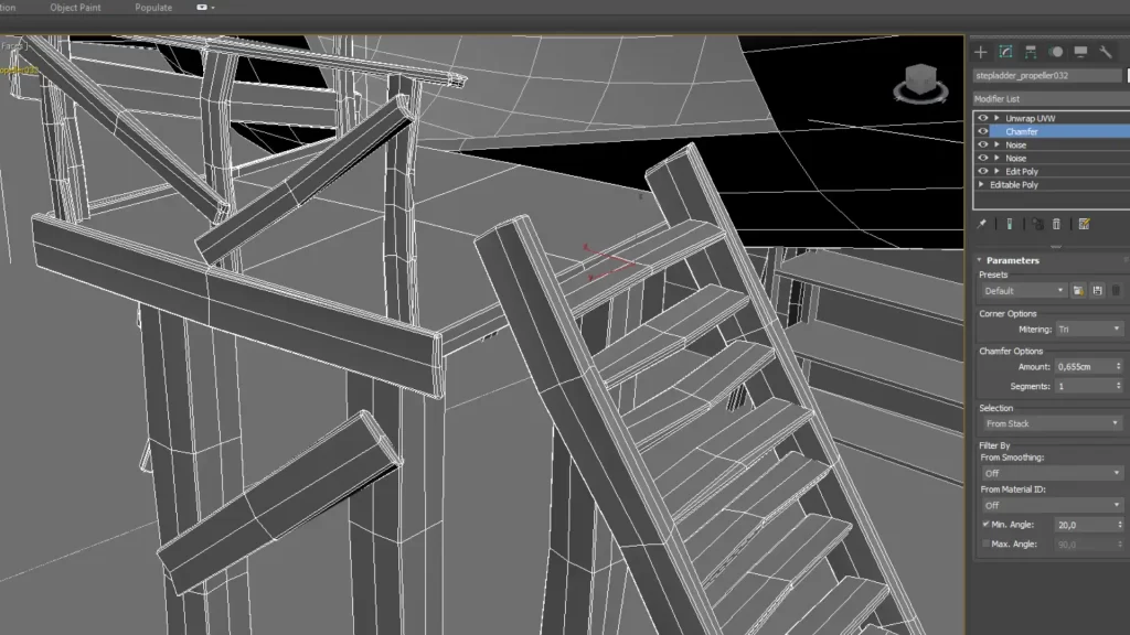 在我之前的一些项目中,我一直在尝试不同的技术,使模型看起来更真实,尤其是建筑、木材、混凝土等。我从中学到的一件事是,没有什么是完全直的,总是有凸起或不规则的线条,我想要探索这一点,甚至夸大它。这就是Max的修改器堆栈最有用的的地方,我可以像平常一样建模各个部分,并在顶部以程序化的方式添加不规则性。例如,我有这个木梁,只是一个普通的立方体网格。我会添加一个噪声修改器,置换顶点,而我只需要在这里和那里添加一些边环,以创建非常不同和有趣的形状。在其上方,添加倒角修改器使我能够拥有圆角边缘而不改变几何体,同时还能使用面加权法线,最终,这些倒角仍然是轻的。