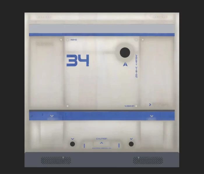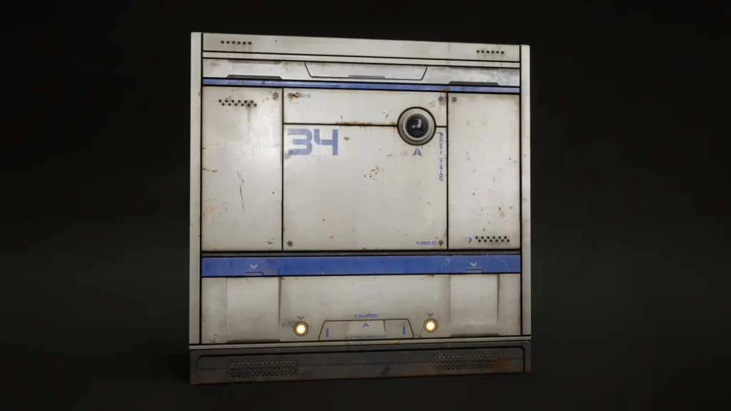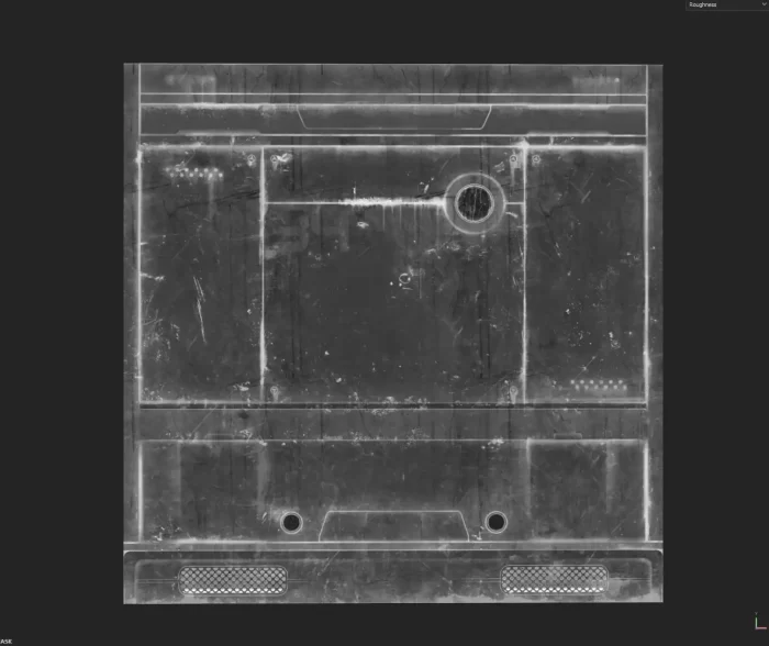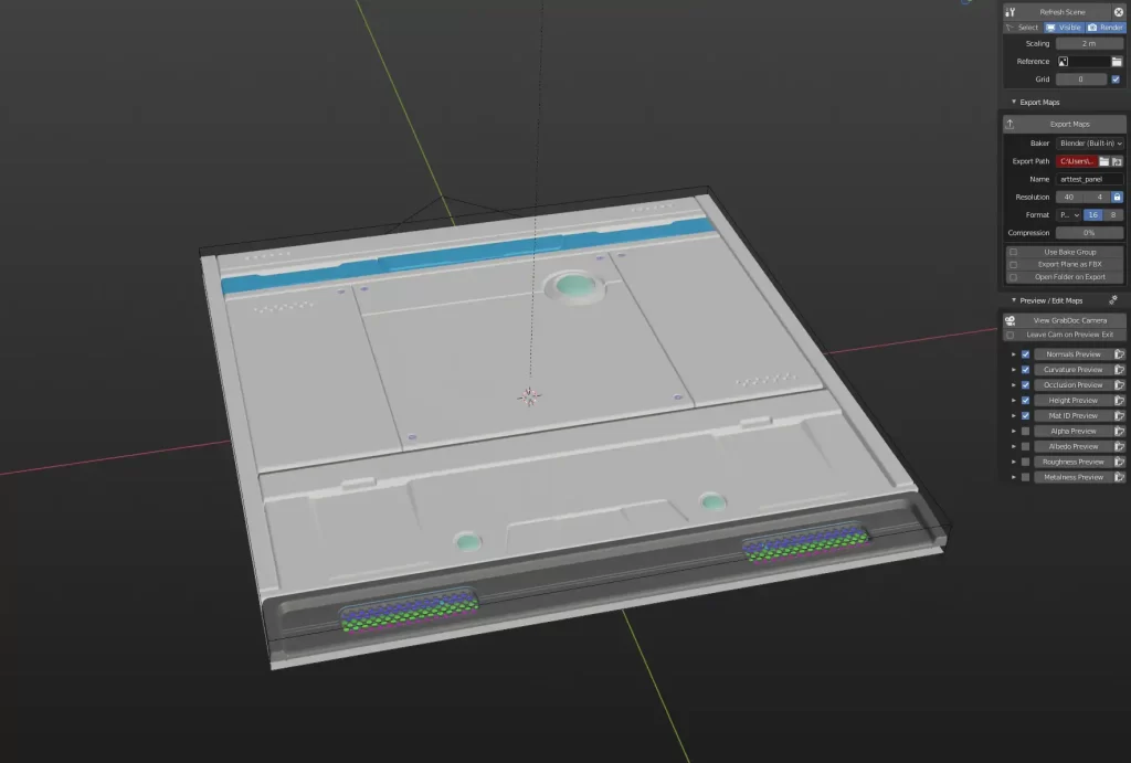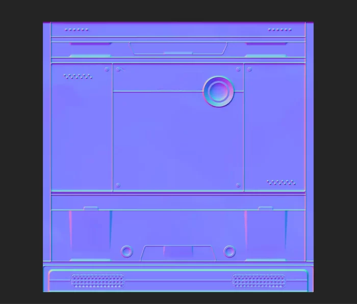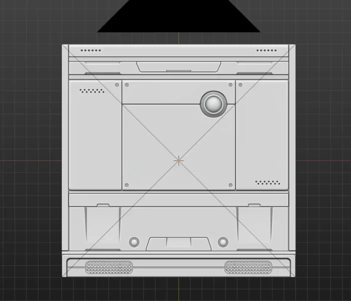 经过一段时间后,我准备好了高精度模型进行烘焙。我决定保留较大的空白区域,不添加过多细节。我的构图重点在于圆形凹槽内的相机位置,以及两个小型灯具(坦白说,我制作它们的主要原因是为了稍后添加发光纹理)。