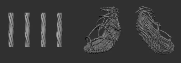 尽管凉鞋在角色整体造型中占比不大,但构造却相当复杂。如果只是制作一个基础网格模型并贴上重复材质以省去麻烦,将无法达到我期望的效果,相比之下会显得过于廉价或简单。