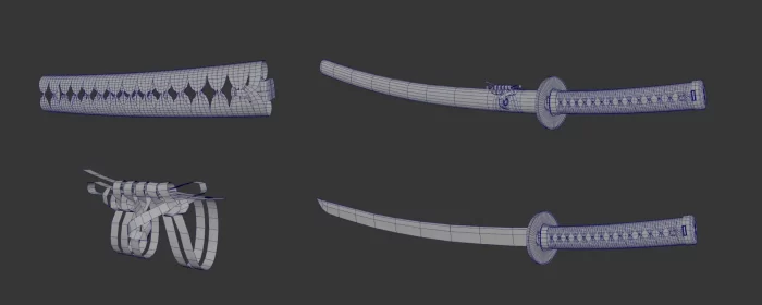 首先,我需要构建一个精确的基础网格模型,确保各部位比例与形状正确。我对刀柄外包层(Ito)和刀鞘缠绳(Sageo)尤为关注,力求理解其复杂性。为此,我查阅了一些相关文献,观看了多个视频,深入理解它们的制作逻辑,这对于正确塑造这两部分至关重要。