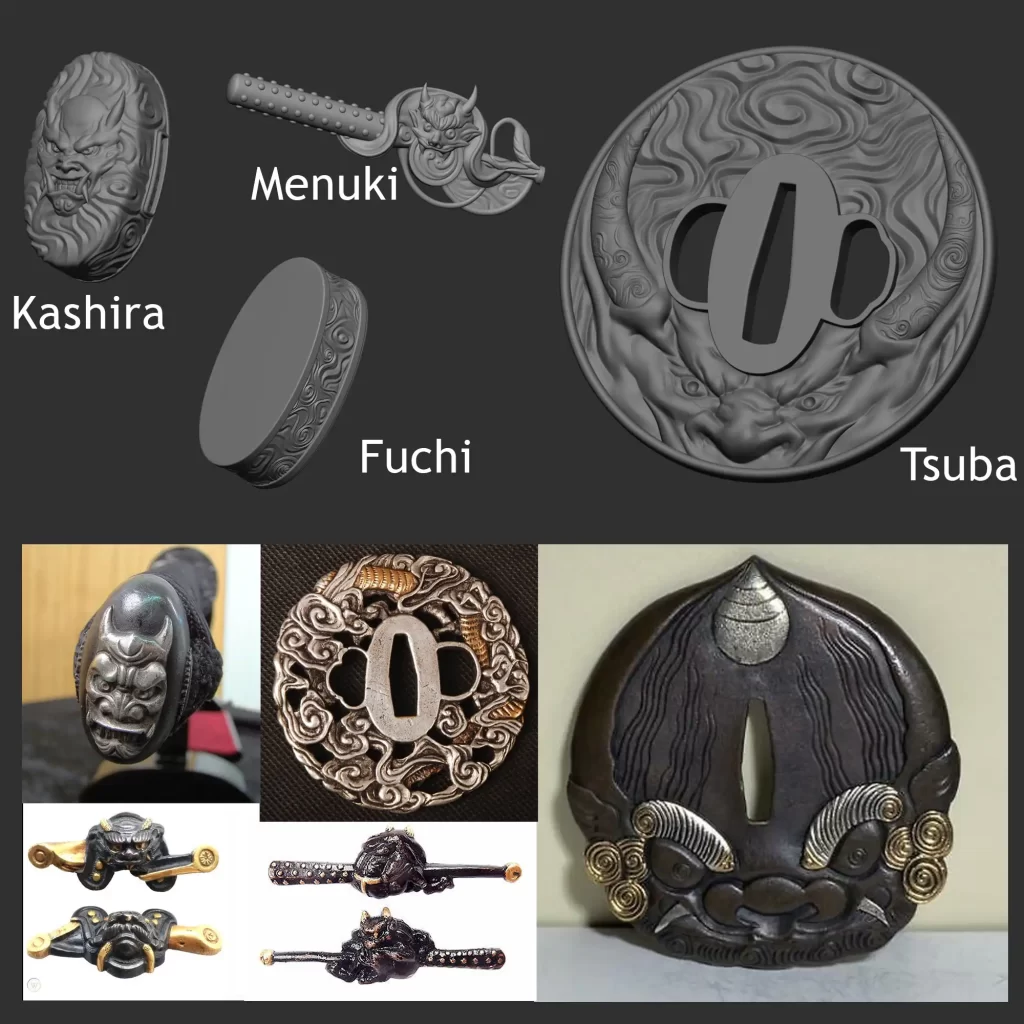 接着,我要将这些主题融入每把刀剑中。它们必须感觉像是同一系列的一部分,设计语言贯穿于Kashira(刀尾环)、Menuki(装饰块)和Fuchi(护手圈)。我参考了实物,但并未简单复制,而是加入了个人创意。所有部件都需要手工雕刻,耗时虽长,但成果令人满意。