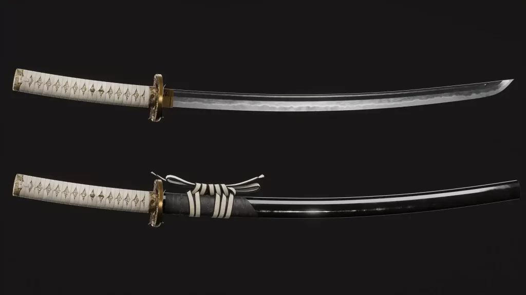 起初,两把太刀设计完全相同,风格简约,没有什么花哨之处,这样做是为了节省时间和精力。然而,一次偶然的操作中,我关闭了其中一把刀鞘的多边形着色,导致刀鞘呈现黑色,另一把则为白色。