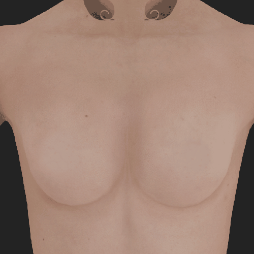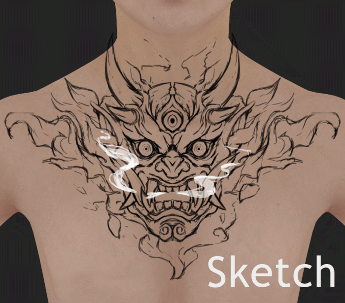制作纹身时,我先截取角色胸部的屏幕截图,然后使用Photoshop在其上绘制草图。将这个草图导入Substance 3D Painter并放置到角色身上。