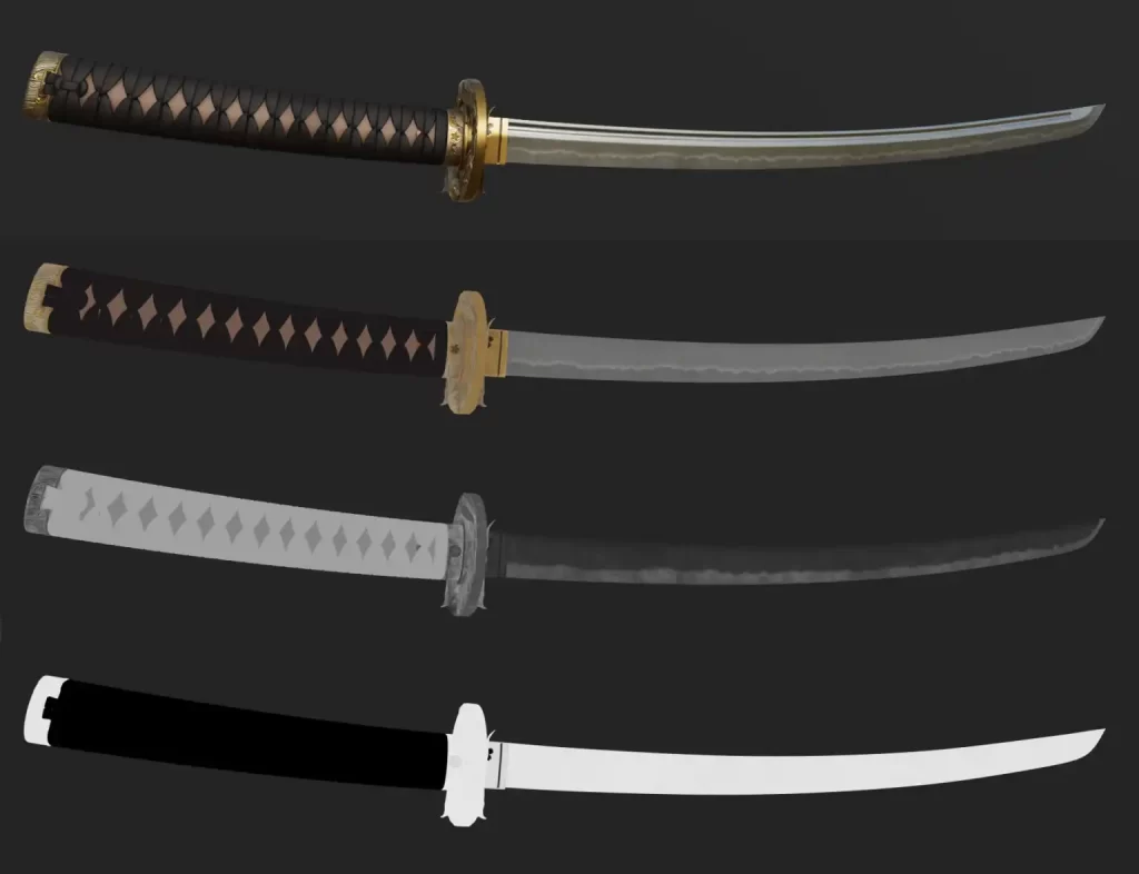 刀剑主要由金属构成,但各部分的处理方式有所不同。对于刀刃,我利用从参考资料中获得的一些高质量特写渲染来捕捉细微细节和瑕疵。