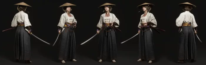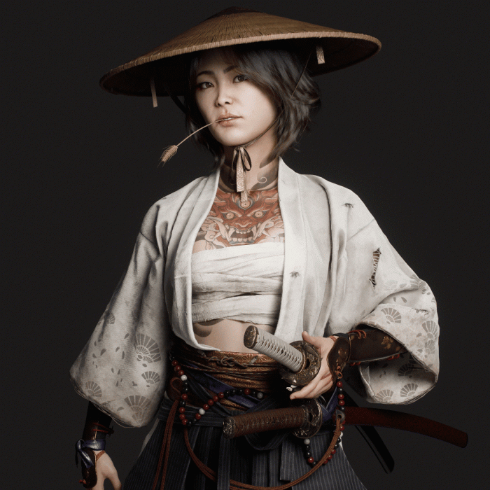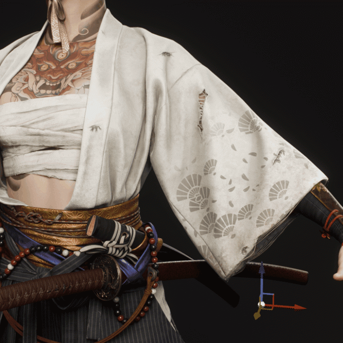 然而,我不满足于单纯复制所见,我希望我的角色尽可能地真实可信。因此,我对我设计中的每一个细节都进行了深入研究。从服装的每一片布料、每一种结绳技法,到刀具的每一部分,我都力求了解透彻。尤其是对于太刀(Katana),我研究了它的所有组成部分、不同设计样式、携带方式以及结绳方法,力求对它有全方位的认识,从而打造出令人满意的外观。