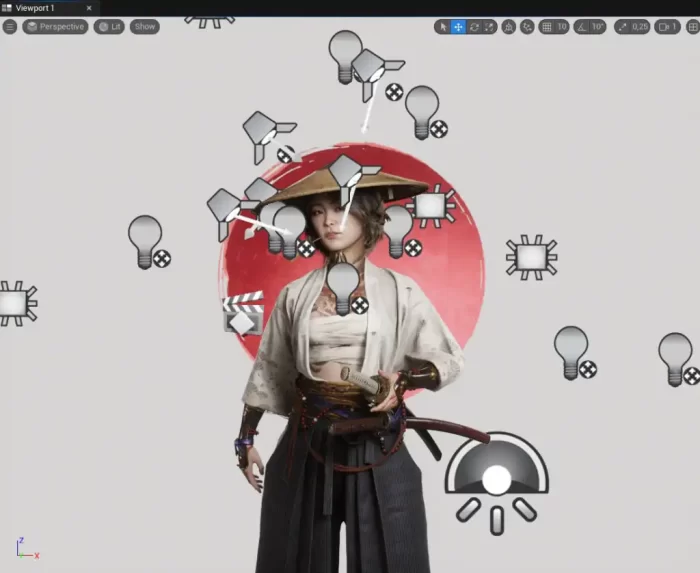 从项目之初,我就决定使用Unreal Engine及其众多功能。我为角色创建了基本的灯光设置,包括主光源(key light)、边缘光(rim light)和填充光(fill light)。接着添加额外灯光,以便在如刀剑等金属表面产生漂亮的高光,同时增加顶部光源以在帽子上营造美观的光照效果。