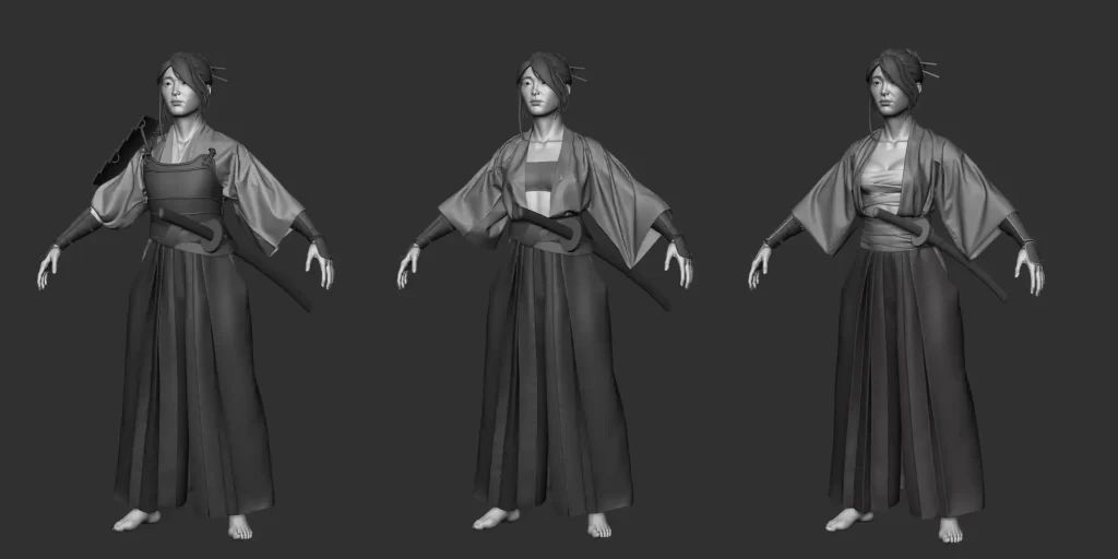 与最终成品相比,初期的设计显得较为简单。后来,我在设计中加入了帽子、凉鞋、第二把太刀、额外的腰带和绑带,得益于基础设计的简洁性,这些改动得以顺利实施且没有造成困扰。