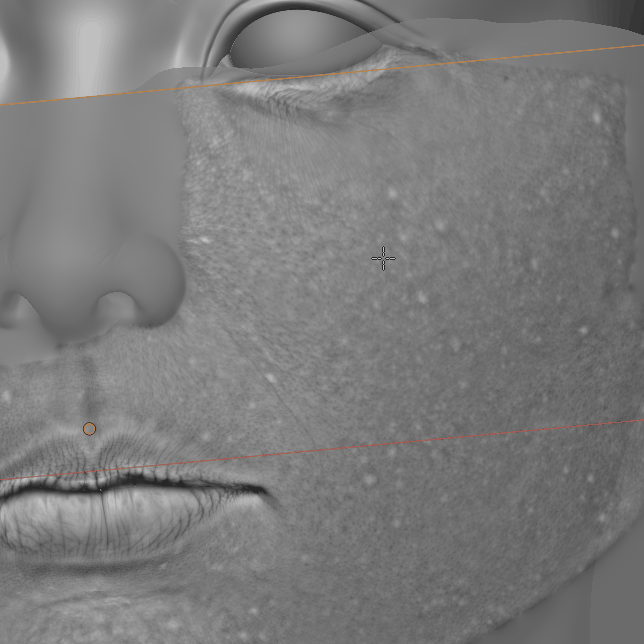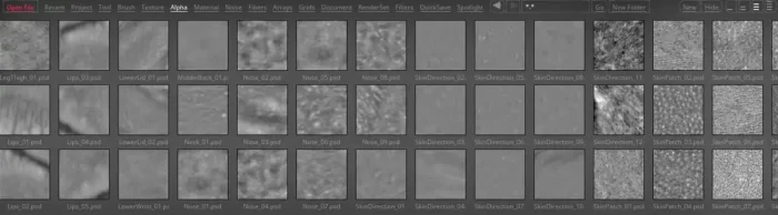 我使用Zbrush的Spotlight工具配合低强度设置下的Standard Brush,将皮肤纹理投射到模型表面。通过这种方法,我成功覆盖了面部大部分区域,但仍存在一些空缺需要填补。我有一套自建的皮肤纹理库,该库由我从不同皮肤纹理中裁剪出的部分组成,并已妥善命名,以便我知道在何处使用它们。