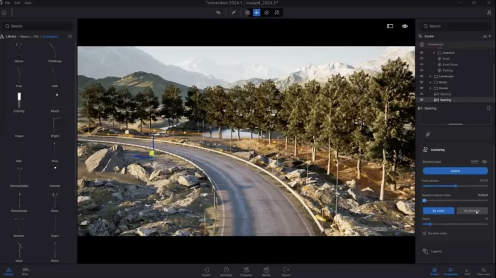 此次预览版还带来了两项新的散射工具,能够快速沿路径或在指定区域内放置大量资产。间距工具用于创建路径,区域工具则用来定义场景中的特定区域,定义完成后,资产将自动填充其中。这些工具支持创建自然或系统化的布局,位于“放置”下的“人群”面板中。
