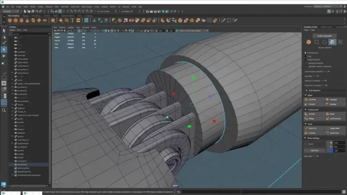 在 Maya 2025 的建模工具集中,最大的亮点是移植自 3ds Max 2021 的智能挤出系统。该系统允许用户在视口中实时交互式地挤出面片,并自动消除手动修复双面和隐藏面的需求。通过智能挤出,完全或部分被挤出操作结果切割或重叠的面将被重建并无缝拼接在一起,使您能够在对象上自由探索和修改多边形网格拓扑结构。