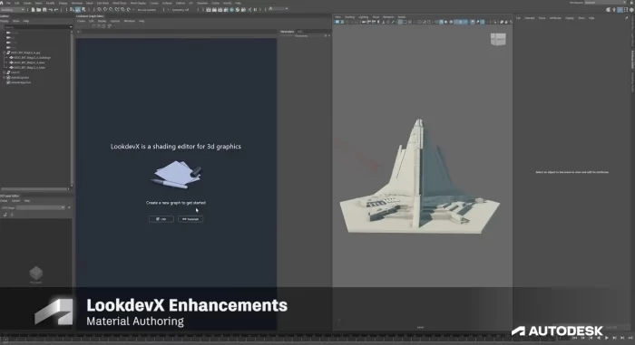 在 LookdevX Graph Editor 的启动屏幕或新建图形标签时,您现在可以选择使用哪种数据模型。当您创建一个 MaterialX 材质时,Maya 会自动创建相应的数据结构,这些结构可在 Outliner 中查看。