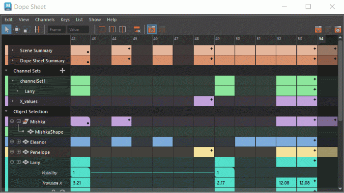 Maya 的 Dope Sheet 编辑器也经过了重构,旨在为艺术家提供直观且更快速的大规模动画管理方式。除了具备自定义颜色调板以视觉区分不同组别的关键帧外,Dope Sheet 编辑器还引入了自定义通道集,意味着您现在可以创建包含常用动画控制的集合。