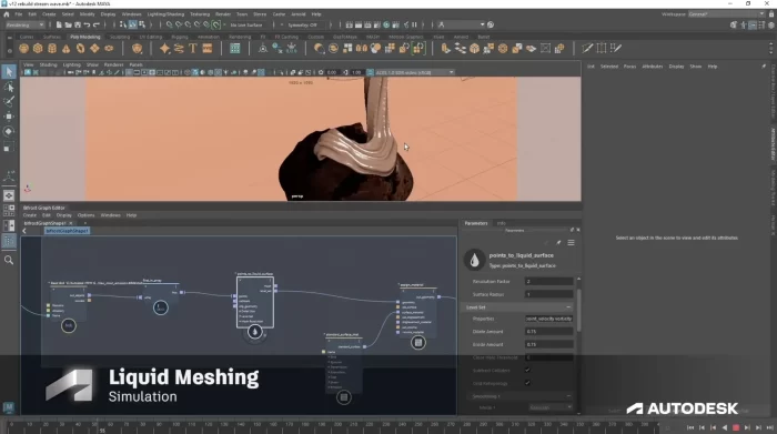 与此同时,Bifrost 图中也新增了内建的液态网格化工具,这是一个模块化化合物,设计用于与从 Maya 中导出的 Bifrost 液体缓存(.bif 文件)配合使用。