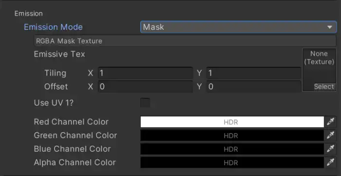 • 自发光饱和度强度(Emission Sat Intensity):饱和度属性滑块对自发光结果的影响程度。0表示完全不使用饱和度值。