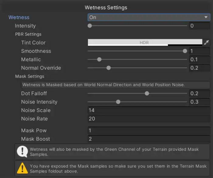• 法线覆盖(Normal Override):使湿润区域的表面法线平滑化。值为0时使用当前法线,值为1时完全平滑。