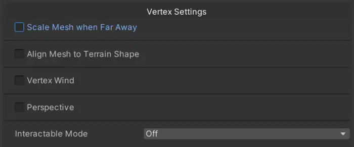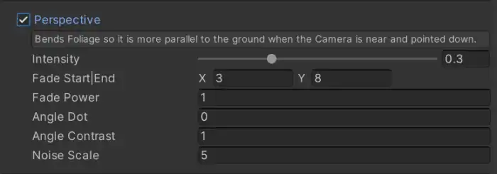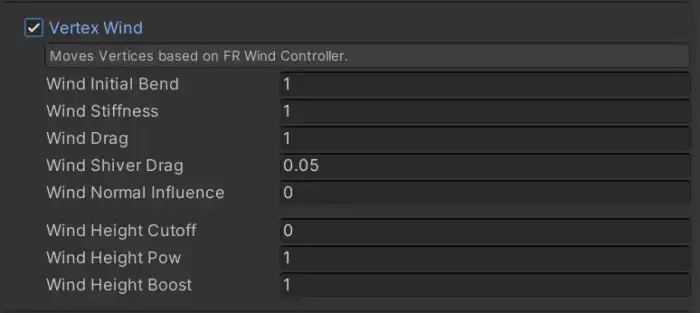 此功能会根据场景中Wind Controller组件的输出来弯曲和抖动顶点。风效可以通过FRDS Wind Controller组件或Foliage Renderer Wind Controller组件更新(后者需要同时安装Foliage Renderer)。这两个类可以互换使用。