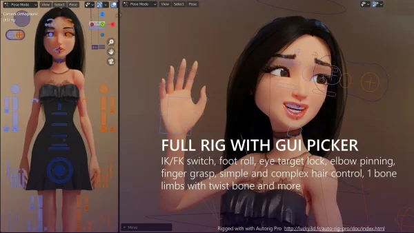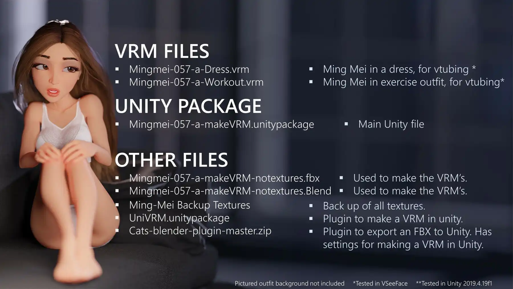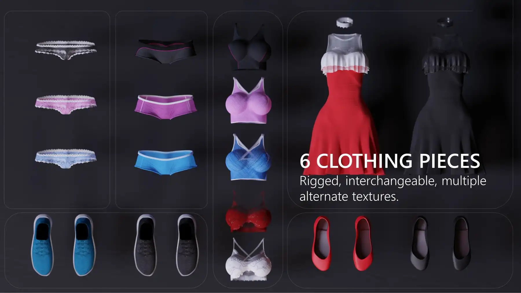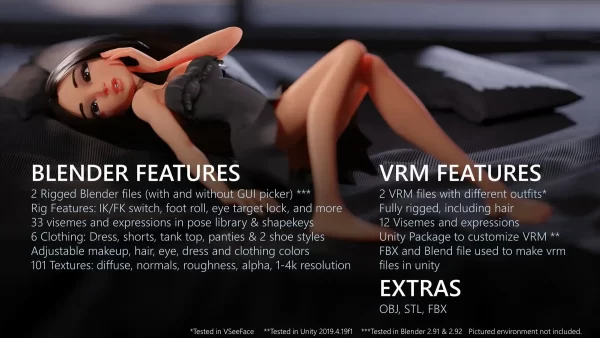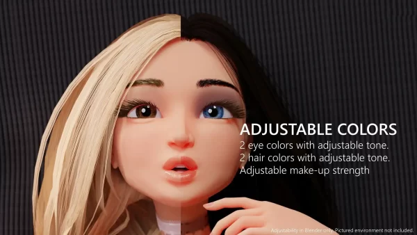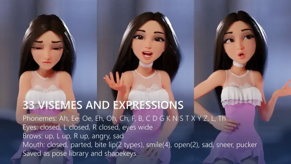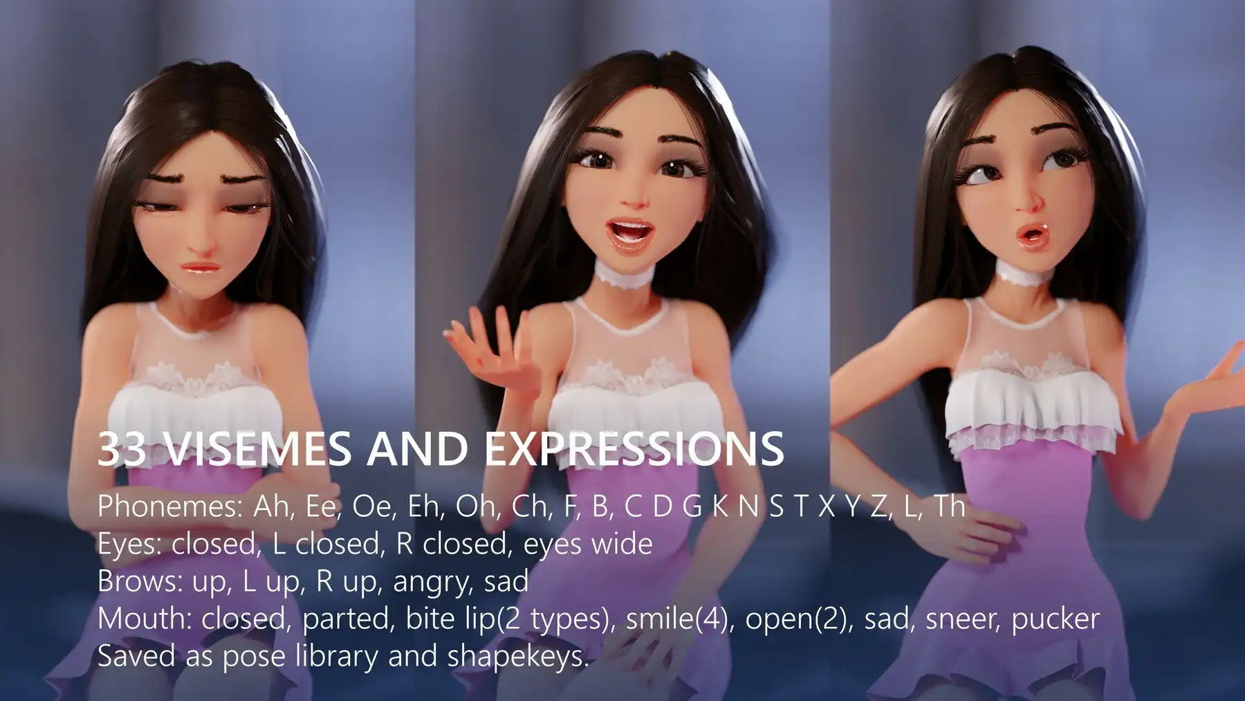 Ming-Mei 是一款使用 Blender 2.91 制作的风格化女性角色,专为 Blender 和 Vtubing 应用设计。模型包含一套高分辨率主体和多款服装:连衣裙、背心、短裤、内裤以及两种鞋款。所有部件均经过纹理处理,包括法线贴图,并具备完整的骨骼绑定,适用于Blender与Vtubing场景。此外,该角色还配备了33种预设表情和形状键,允许用户调整妆容、发色、瞳色和衣物颜色。角色包含101种纹理,涵盖漫反射、法线、粗糙度、透明度等多种类型,分辨率从1k至4k不等。随附的海滩摄影舞台为用户创作高质量渲染提供了便利。