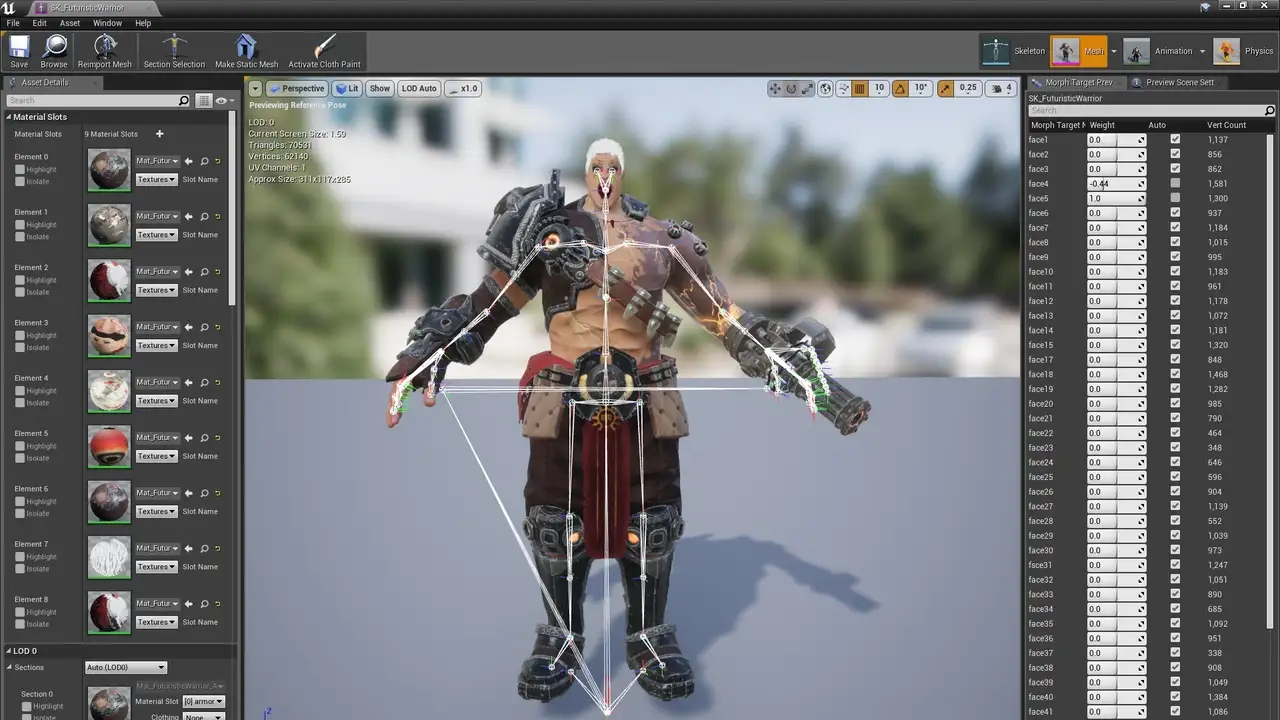 高精度赛博战士角色模型,含47,554顶点与43组专业动画(含3组位移动画),适配UE4/UE5项目。模型基于Epic骨架(含IK骨骼),支持19组材质实例与51张4K/2K纹理,覆盖战斗/待机/战术动作全流程。