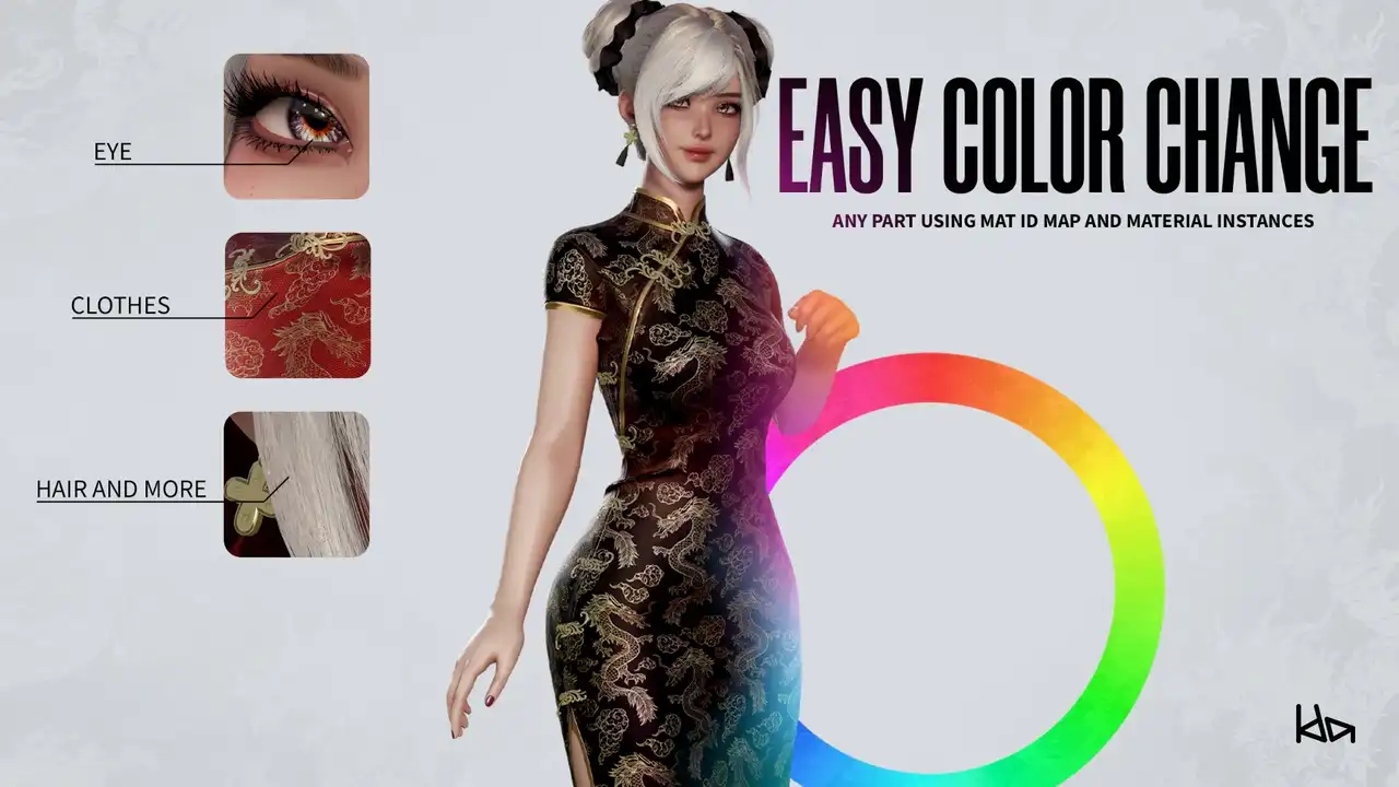 - 材质系统:48个材质实例,含MatID贴图,支持皮肤/眼睛/头发/服装等独立调色
