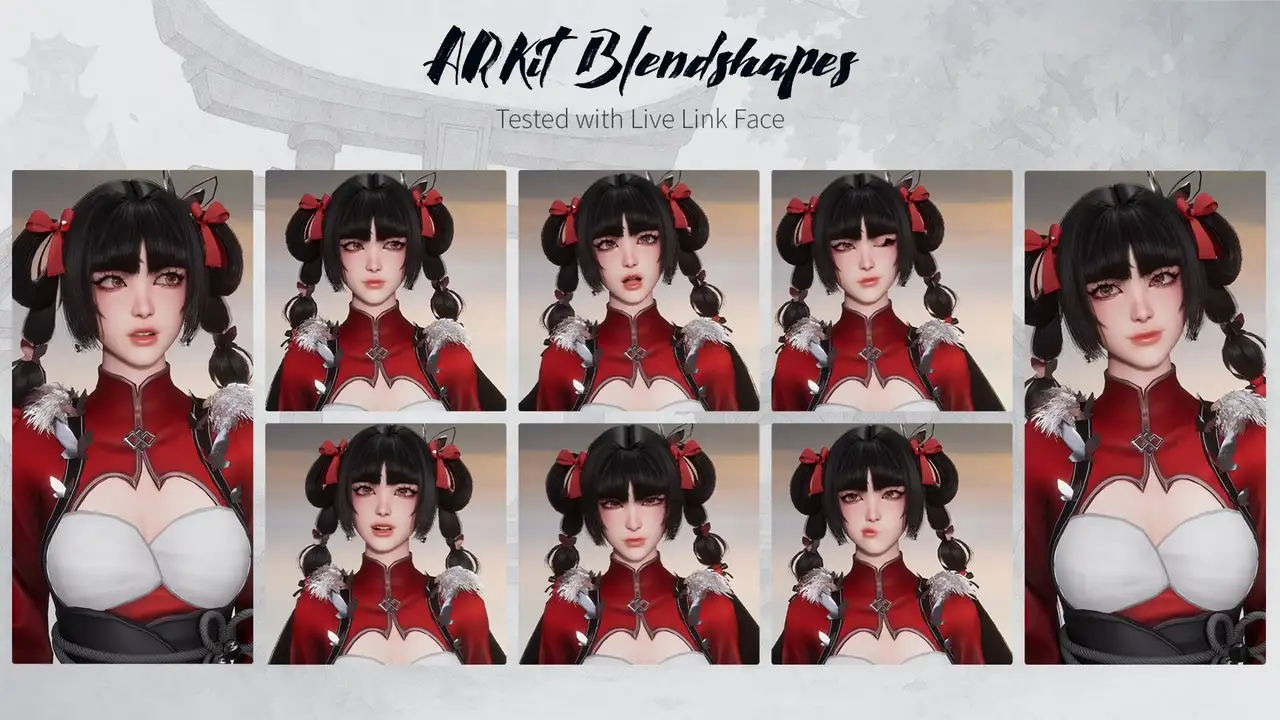 - 52个ARKit Blendshapes:完美校准,支持UE5 Live Link Face 与 Unity Face Capture,适用于直播、VRChat、MMD、FaceWare等;