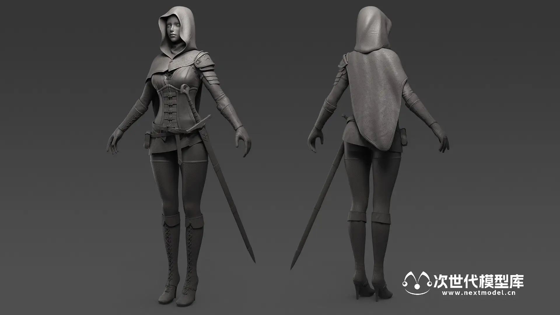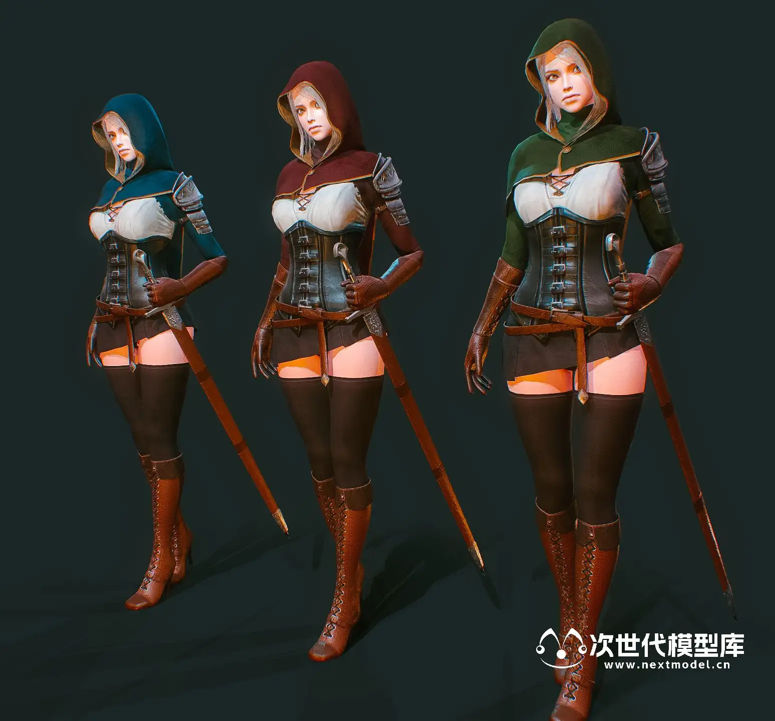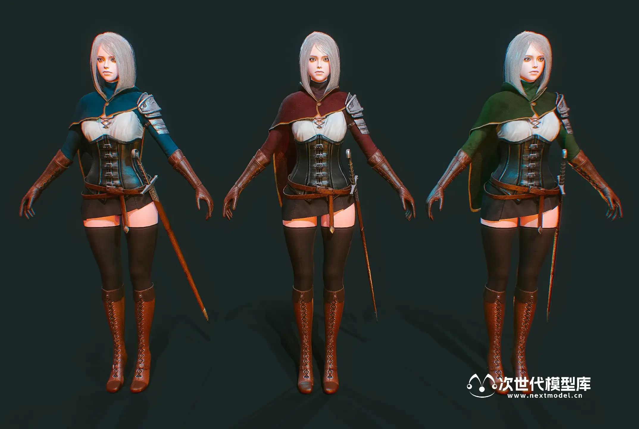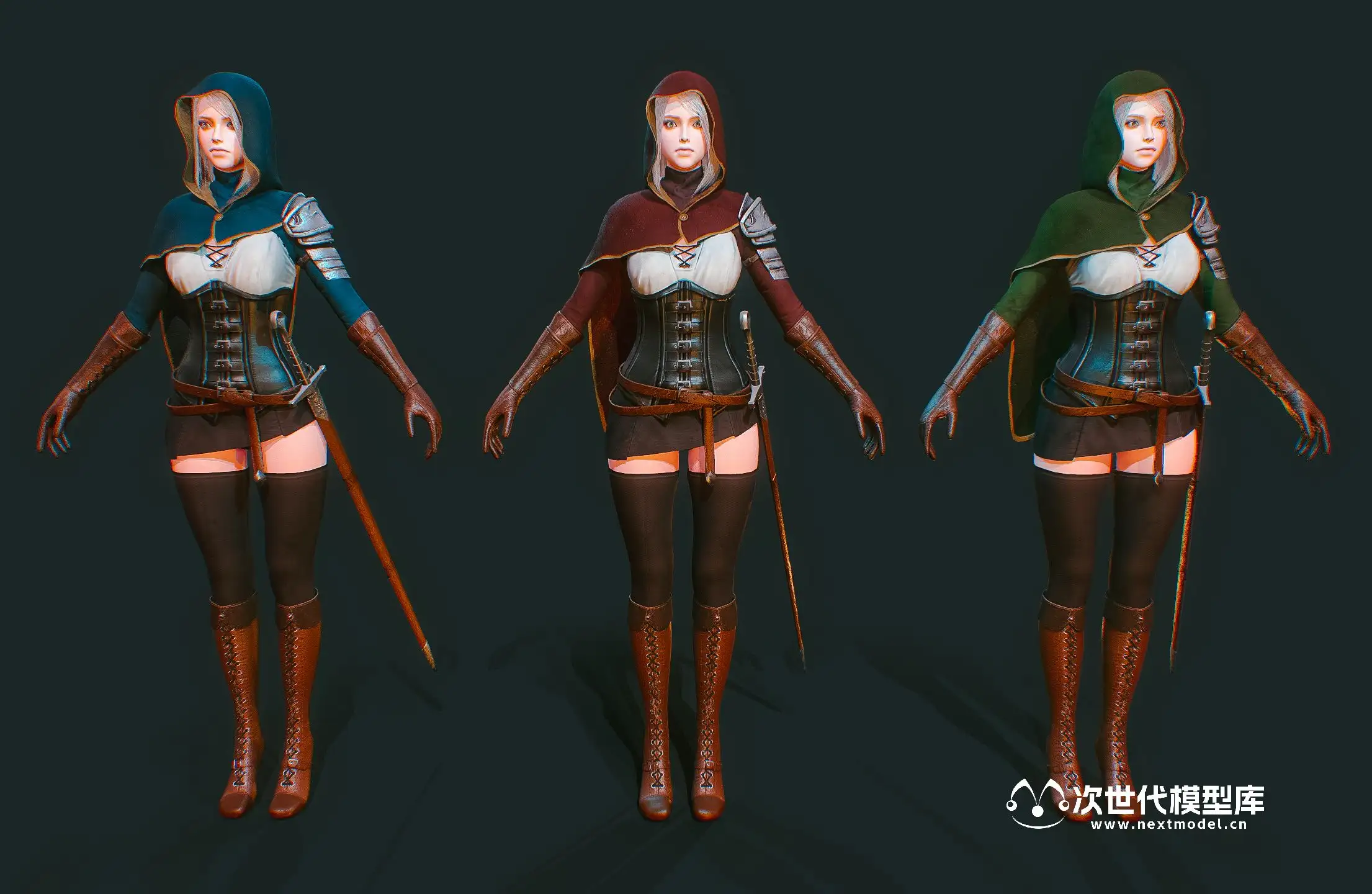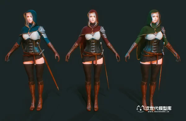 高品质的美少女剑客角色模型,该模型资源包含多种格式,如UE、Unity和Maya.mb文件等。模型包含3种颜色变化的衣服和2种发型(带帽和不带帽),还有第三人称动画效果。模型的Polycount为39859个面,57249个三角形,41784个顶点。此外,该模型采用PBR贴图(金属度/粗糙度)制作,有4K分辨率的贴图包括法线贴图、金属贴图、粗糙度贴图、反射率贴图、环境遮挡贴图和透明度贴图。模型还提供了7种纹理组,分别对应脸部、身体、盔甲、头发、眼睛、披风和剑。模型有3种颜色变化(红色、绿色、蓝色)和2种发型(带兜帽和不带兜帽)。