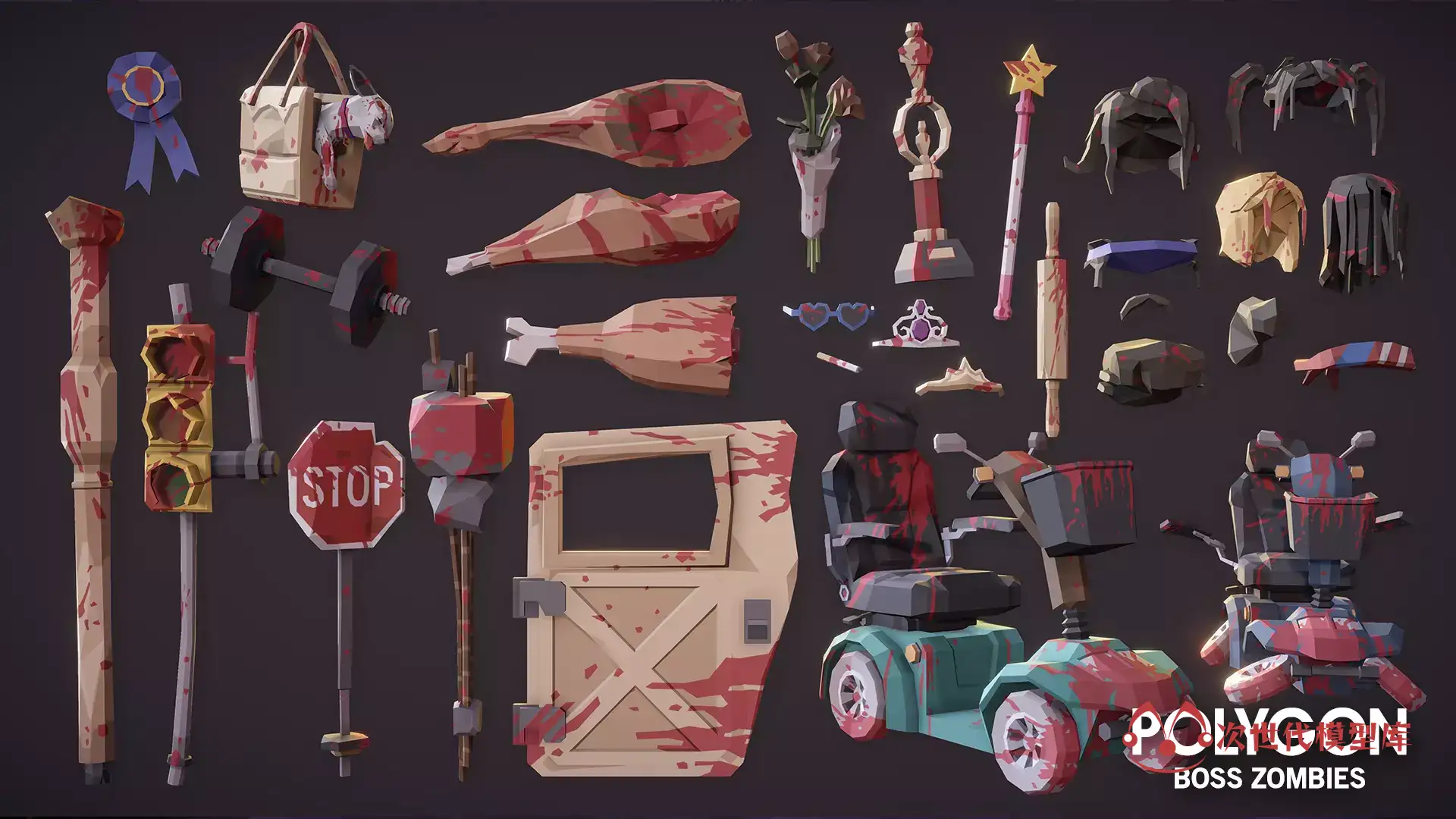 僵尸头目角色、武器和道具资产的低多边形资产包,用于创建基于启示录的多边形风格游戏。4 个僵尸头目 带有自定义着色器以添加血液。支持通用渲染管道 (URP) 技术参数 资产体积:8MB 资源格式:Unity资源包 资源版本:POLYGON - Boss Zombies v1.01 支持Unity版本:2017.4.10或更高、支持URP