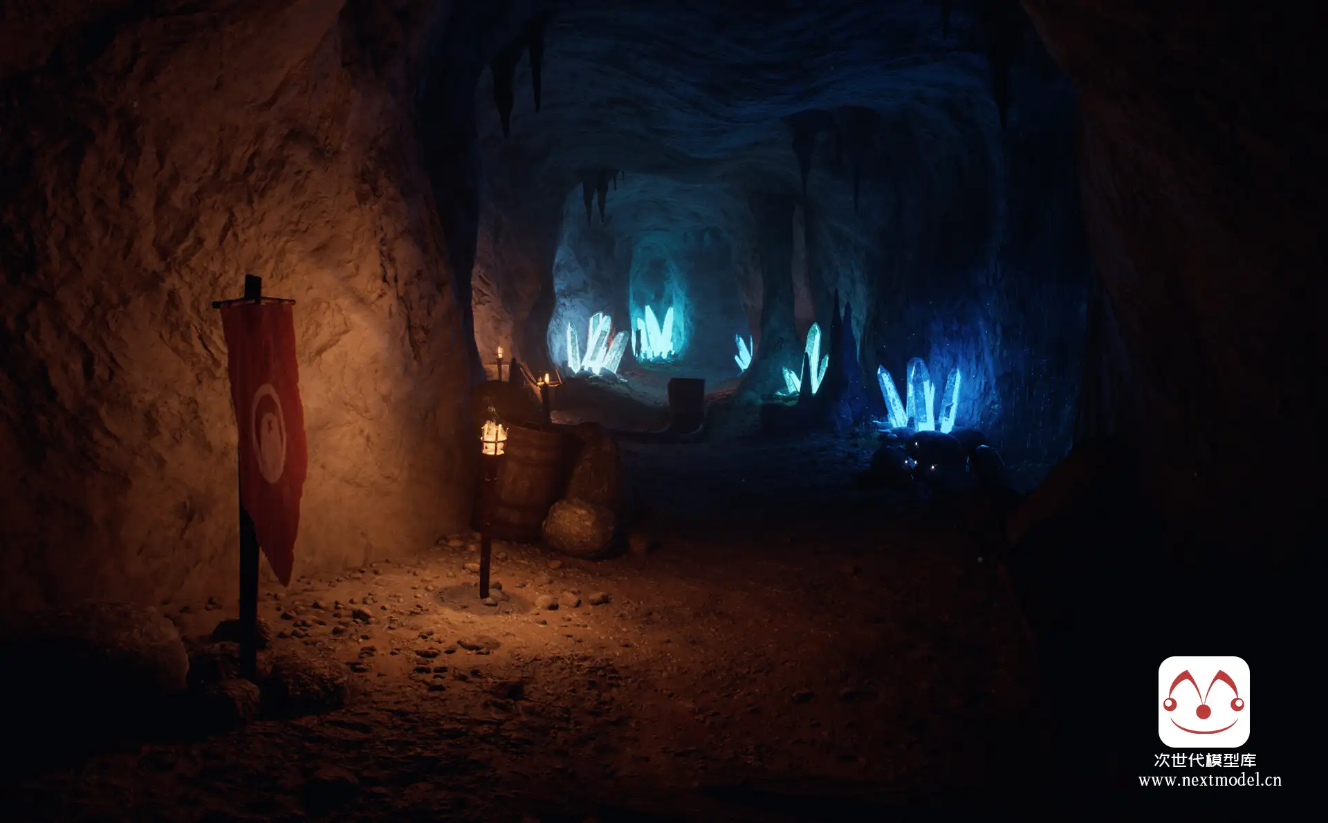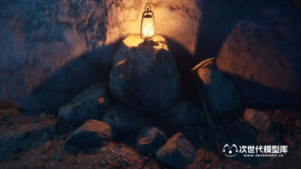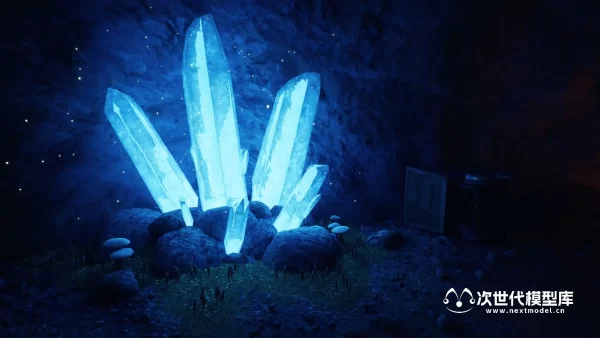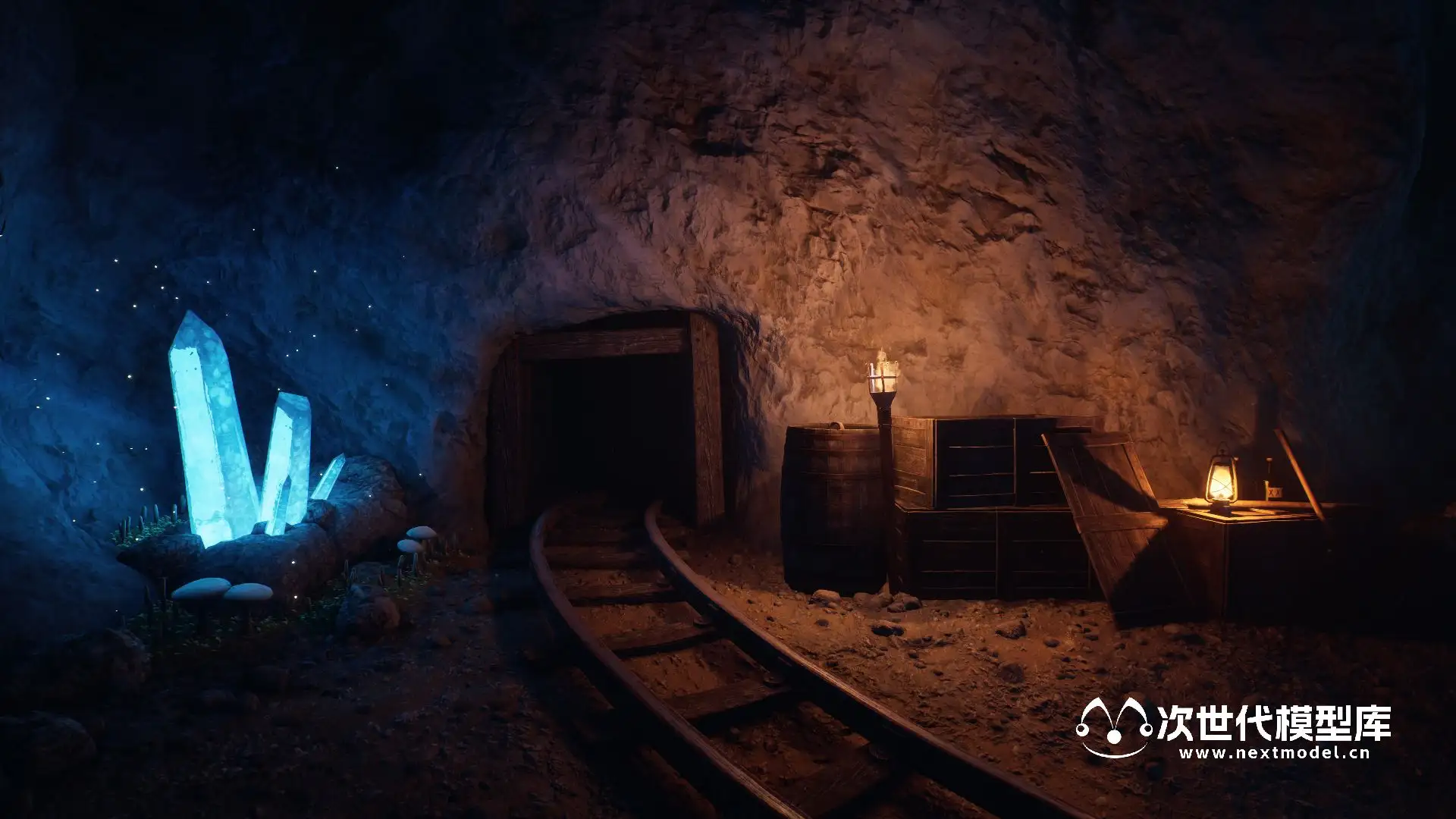 场景包含以下内容:4 块岩石、4 块石头、8 颗带有独特着色器的水晶、4 颗钟乳石、4 根岩柱。 洞穴墙壁和地板的材料和纹理。 矿车,铁路,采矿工具,木箱,桶,麻袋。 6个蘑菇,3个小叶子,苔藓斑。 灯笼,火炬,发光的水厂。