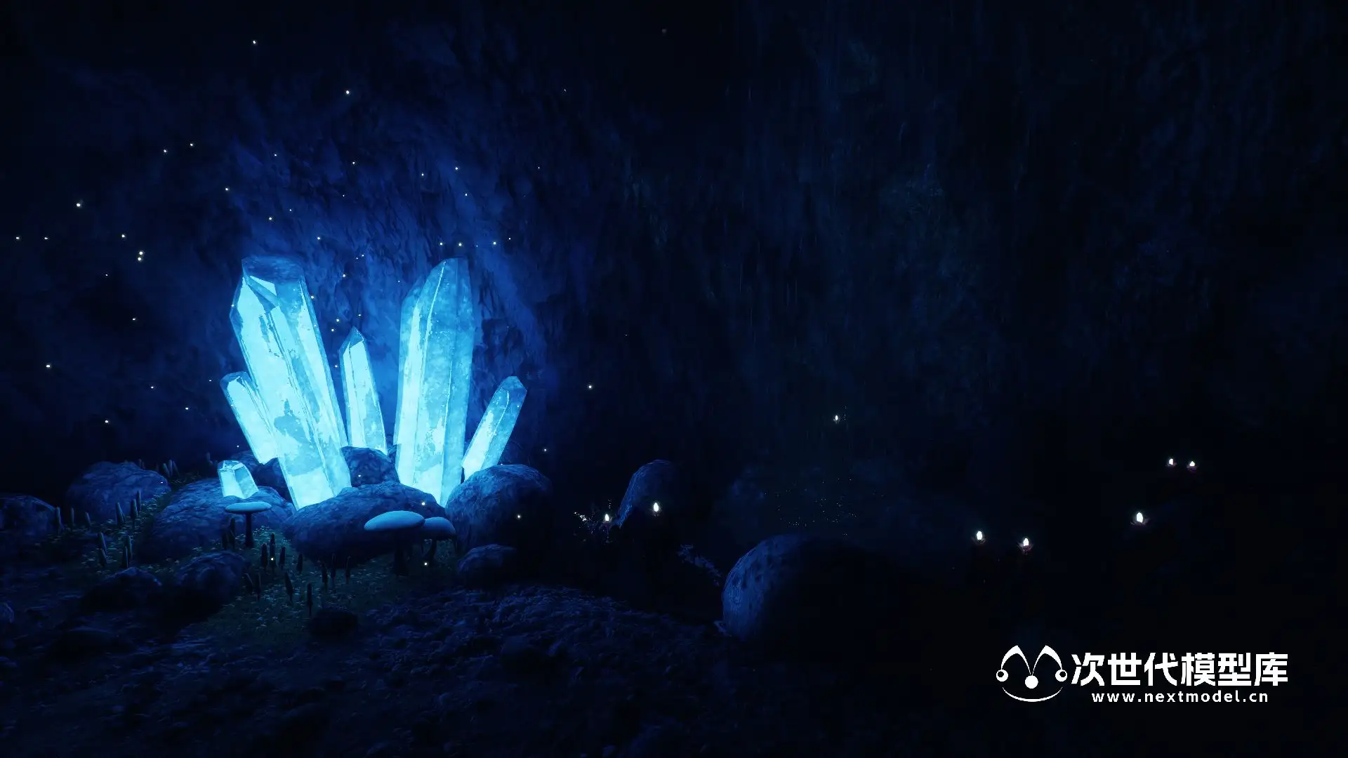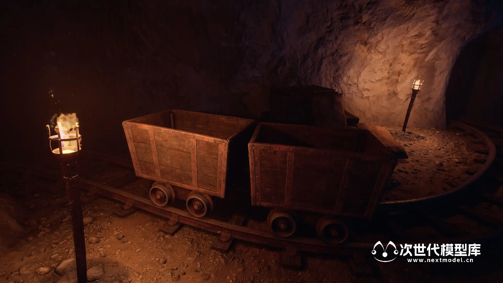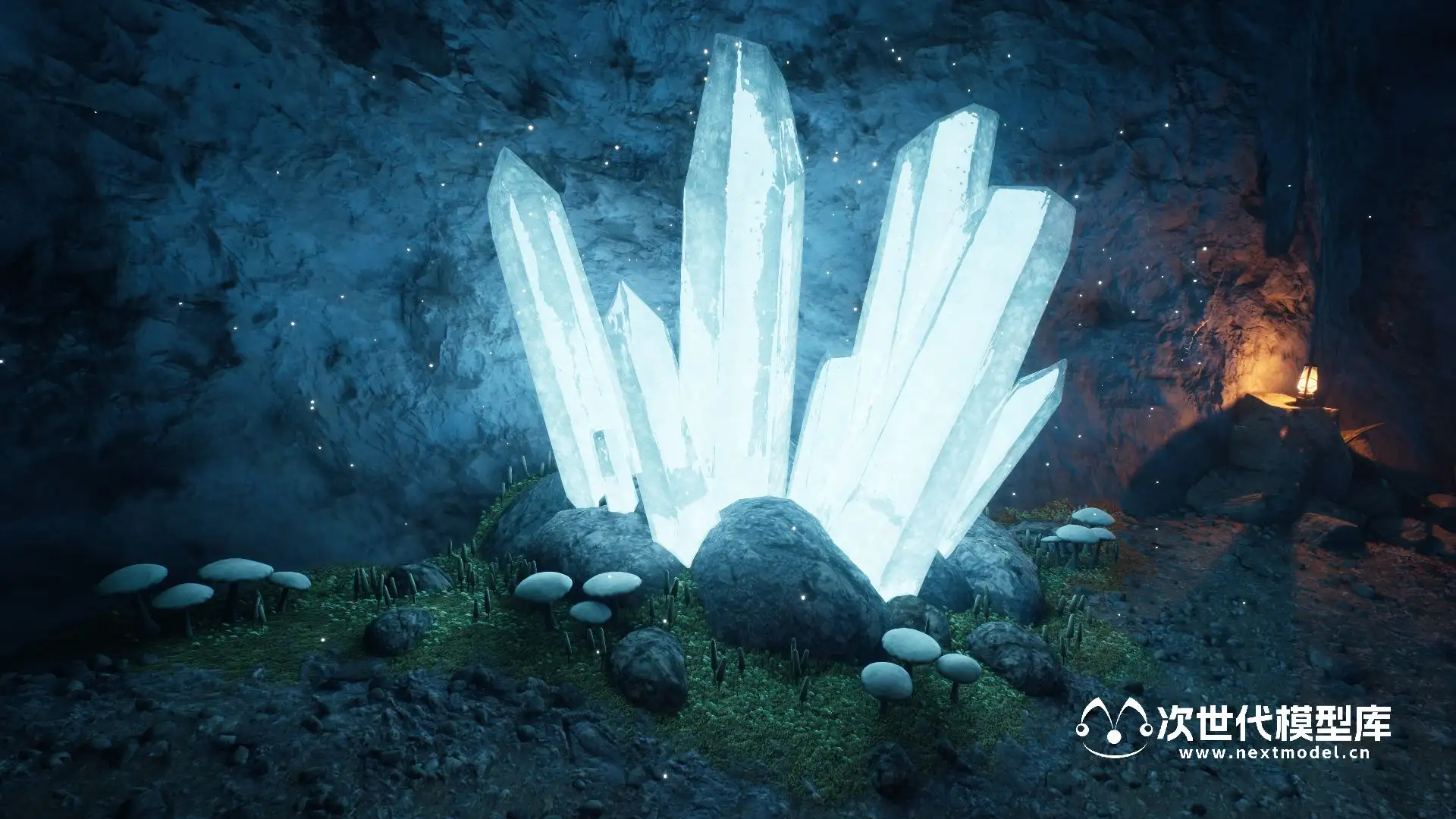 场景包含以下内容:4 块岩石、4 块石头、8 颗带有独特着色器的水晶、4 颗钟乳石、4 根岩柱。 洞穴墙壁和地板的材料和纹理。 矿车,铁路,采矿工具,木箱,桶,麻袋。 6个蘑菇,3个小叶子,苔藓斑。 灯笼,火炬,发光的水厂。