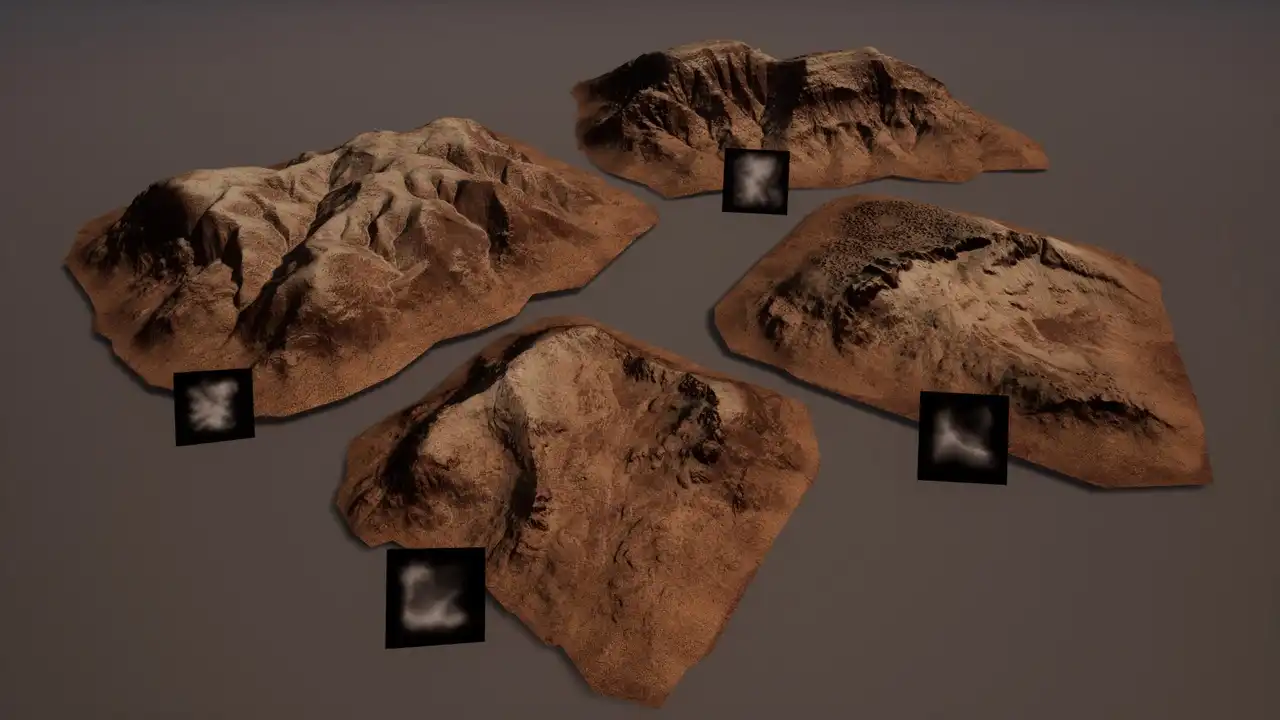 - 地形刷: 4个独特的沙漠戈壁山脉地形刷,每个地形刷都包含网格和Alpha刷。