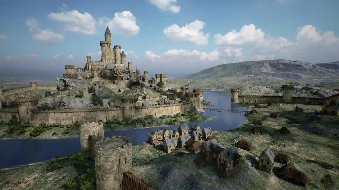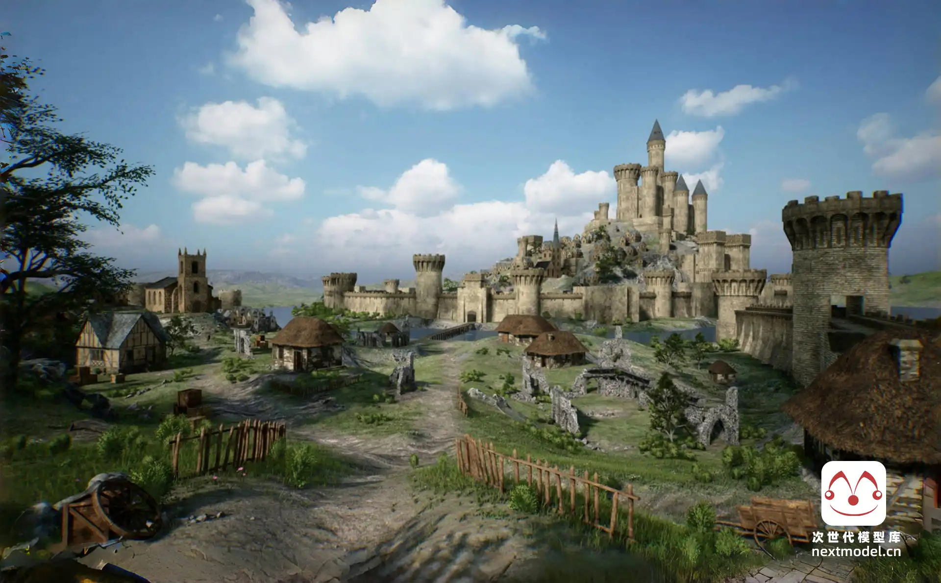 - 示例场景: 包含大型城堡场景、背景景观、水材质、天空穹顶和照明设置。