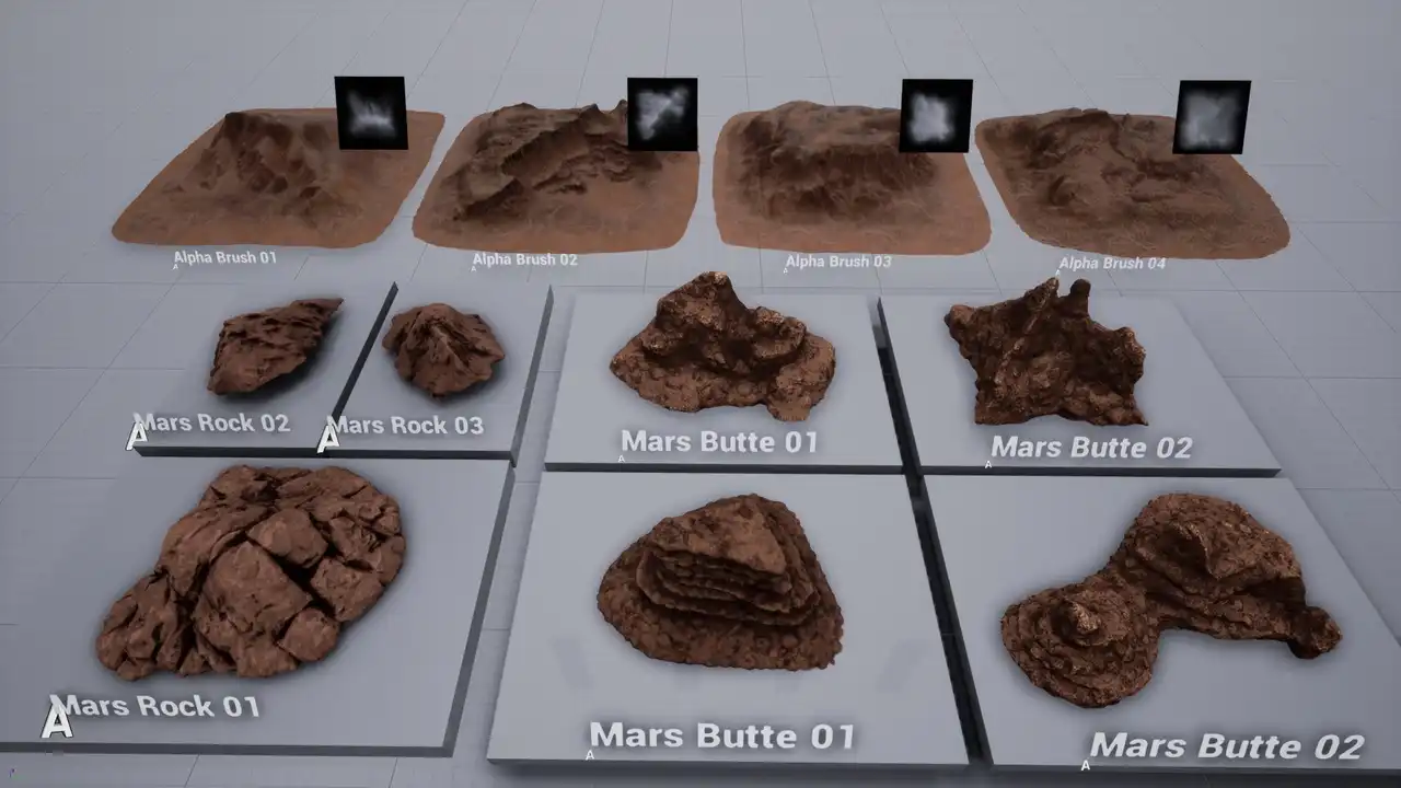 - 包含一个现成并优化过的64km² (8km x 8km) 的火星关卡,已经使用Brushify资源构建完成。