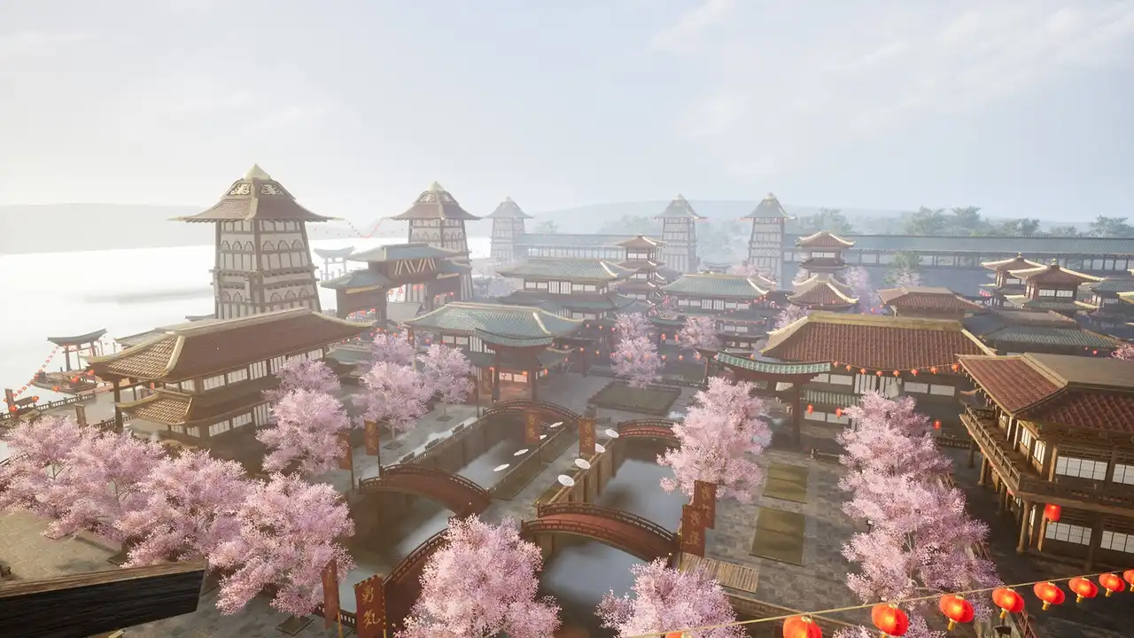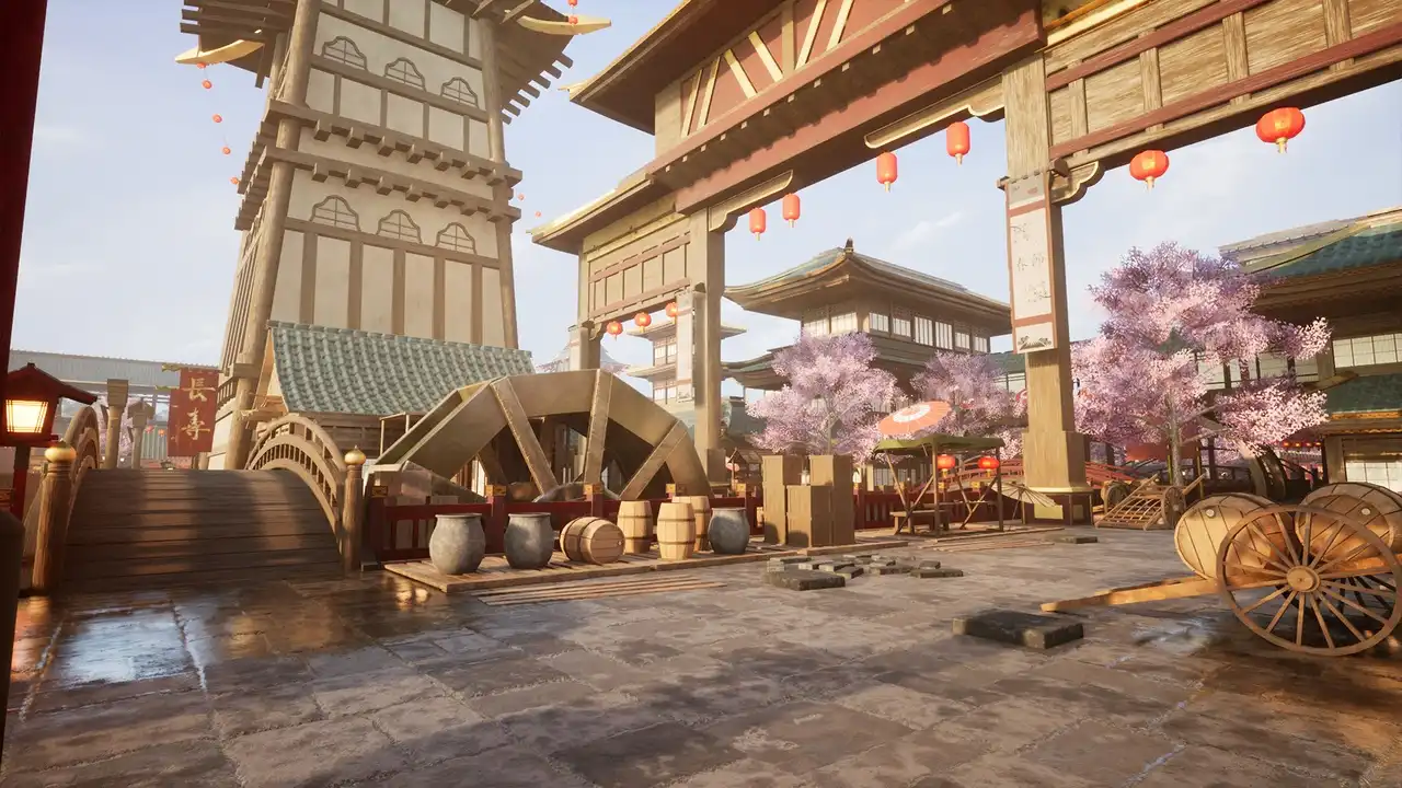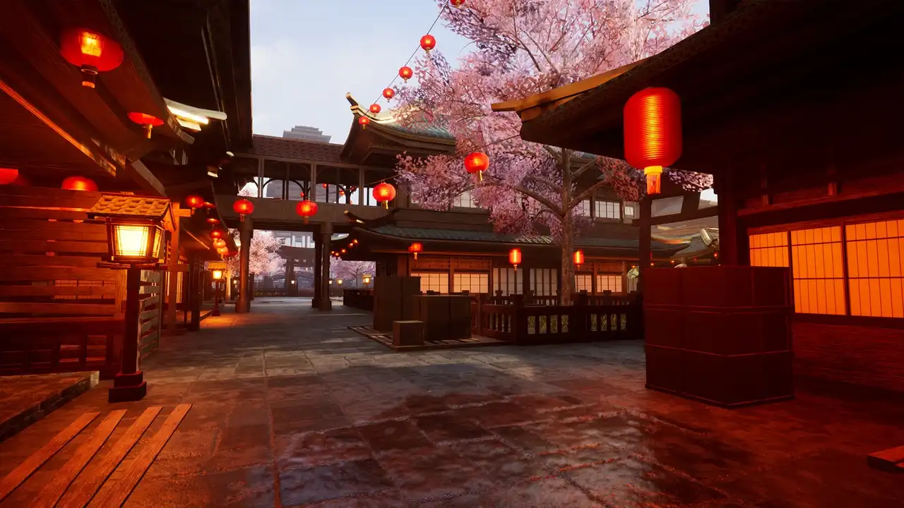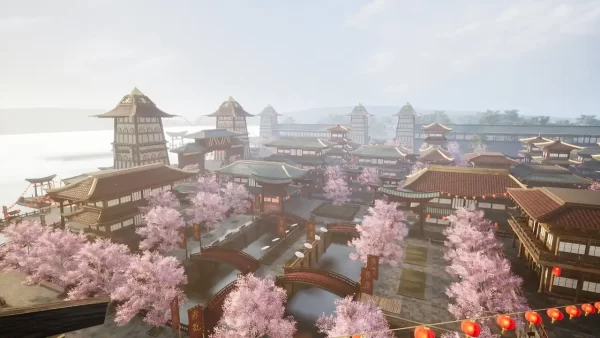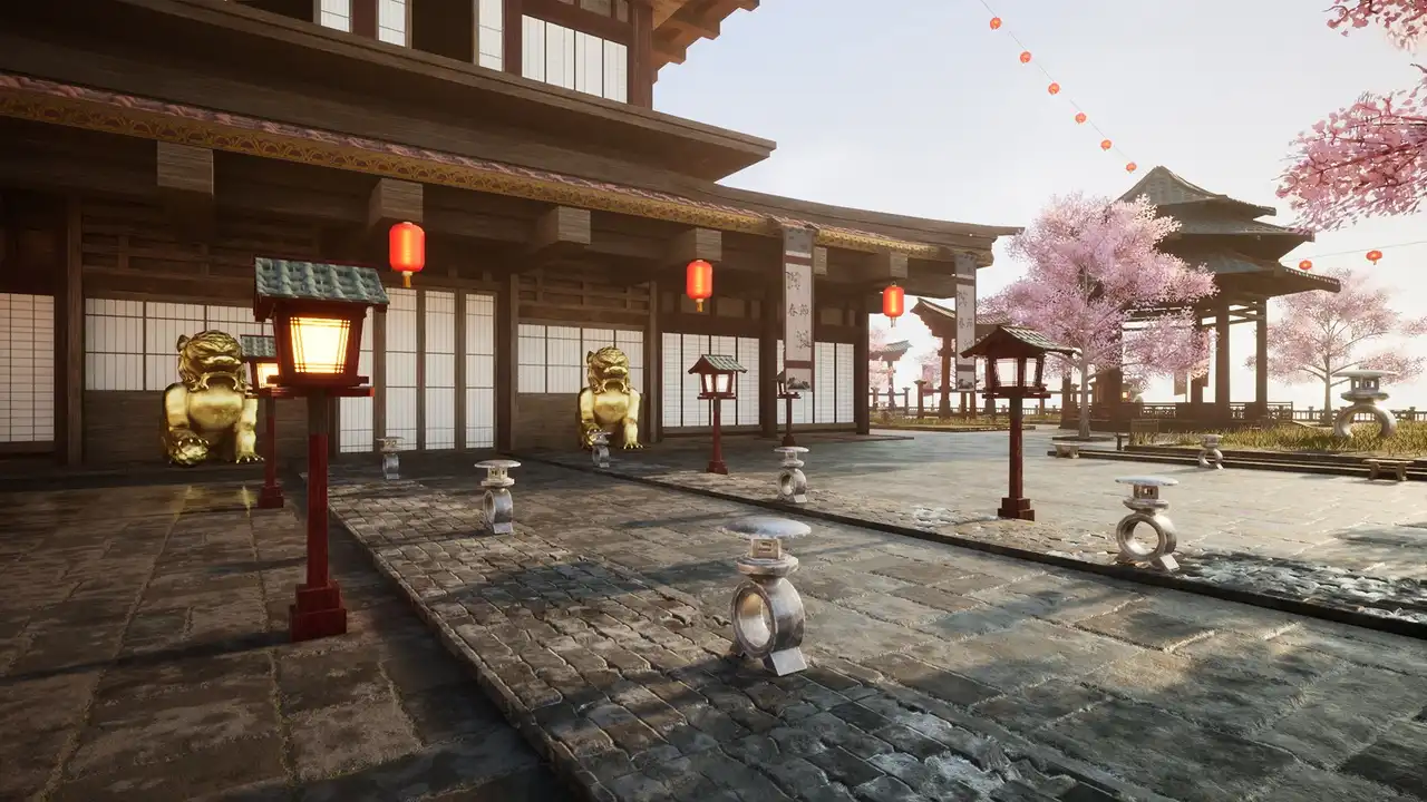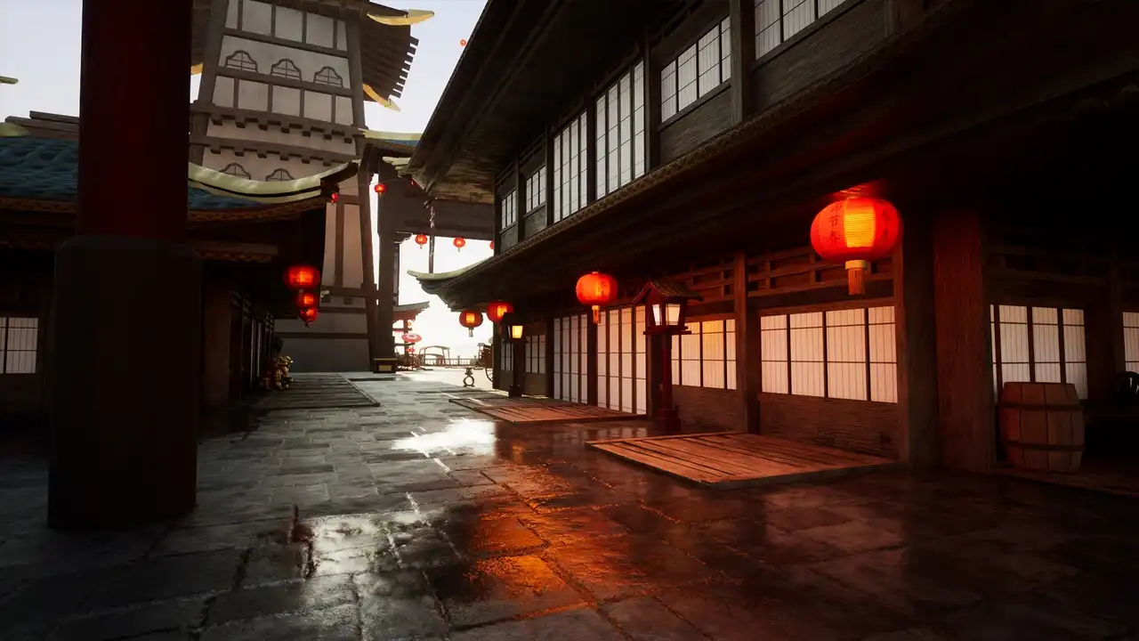 - 模块化拼接系统:墙体、屋顶、地形模块均采用标准化比例(Epic Skeleton Scaling),支持快速搭建复杂城市布局;Spline蓝图系统可一键生成沿路径分布的灯笼链,提升场景叙事效率。