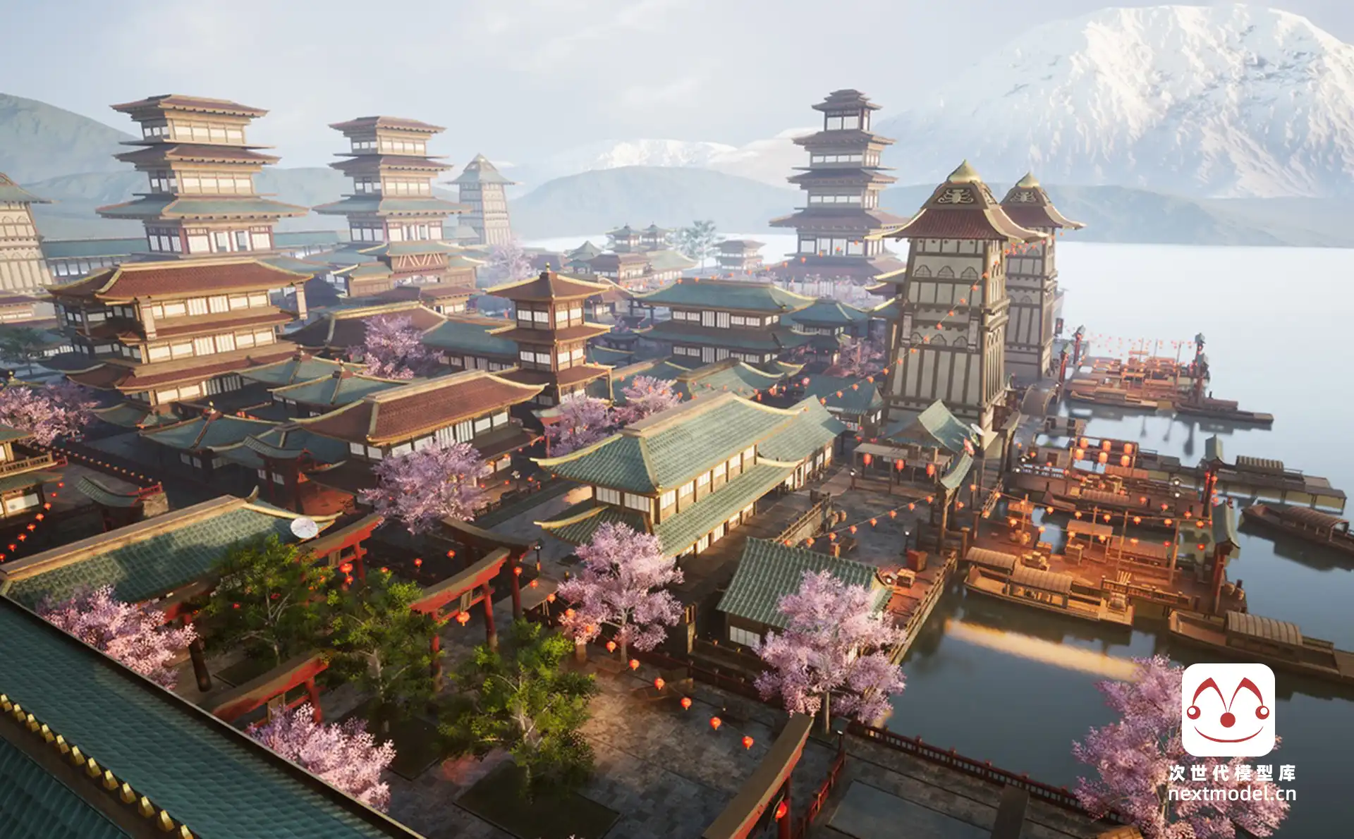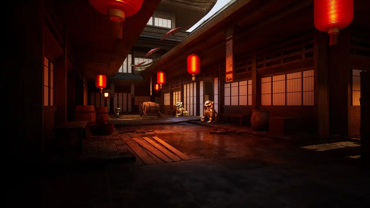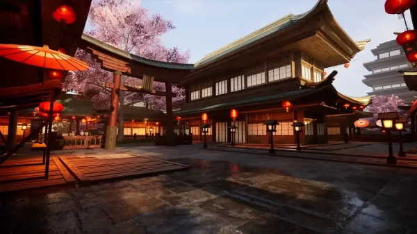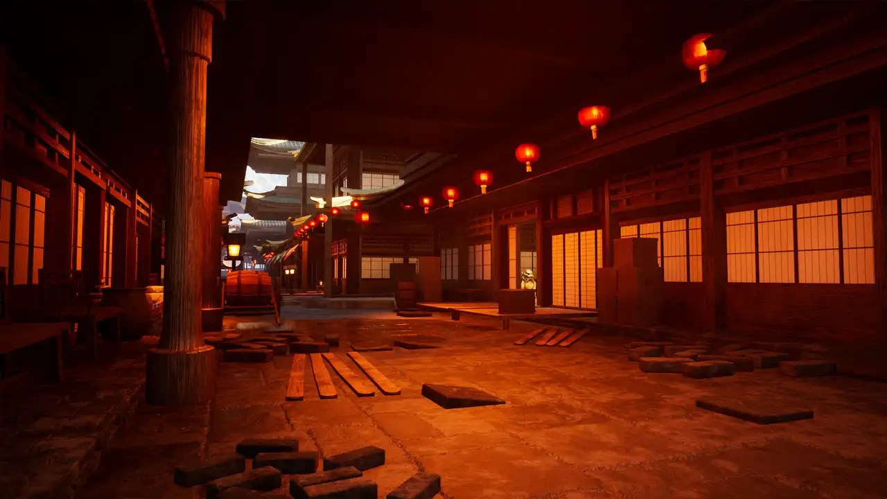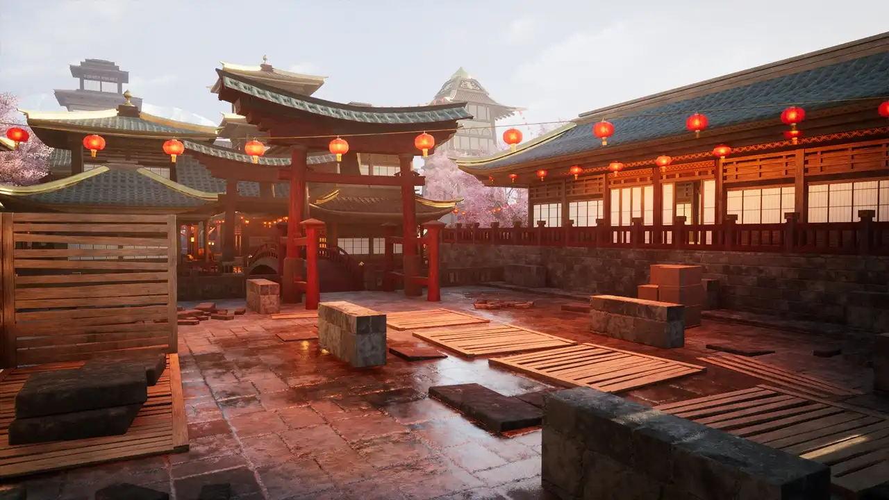 - 模块化拼接系统:墙体、屋顶、地形模块均采用标准化比例(Epic Skeleton Scaling),支持快速搭建复杂城市布局;Spline蓝图系统可一键生成沿路径分布的灯笼链,提升场景叙事效率。