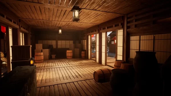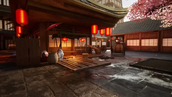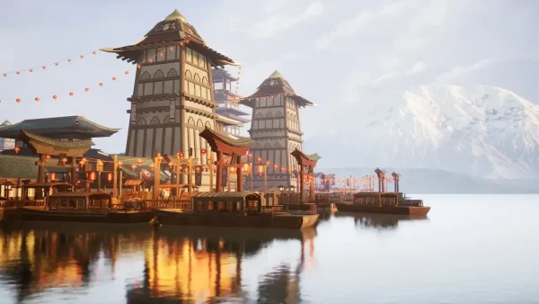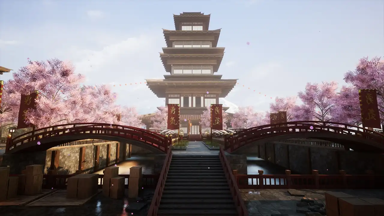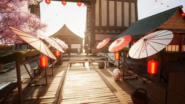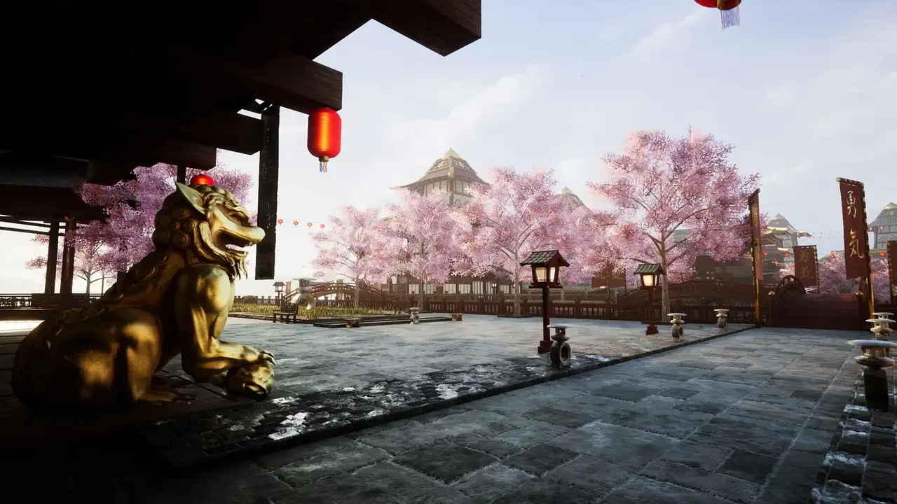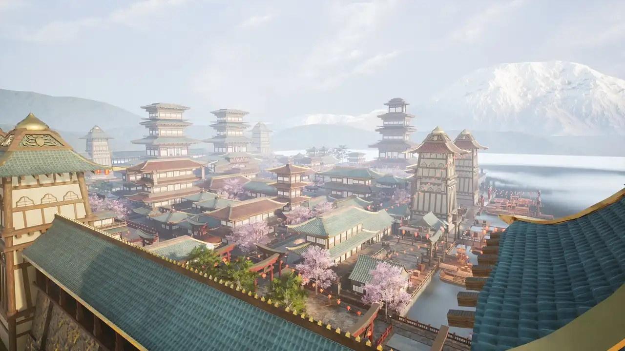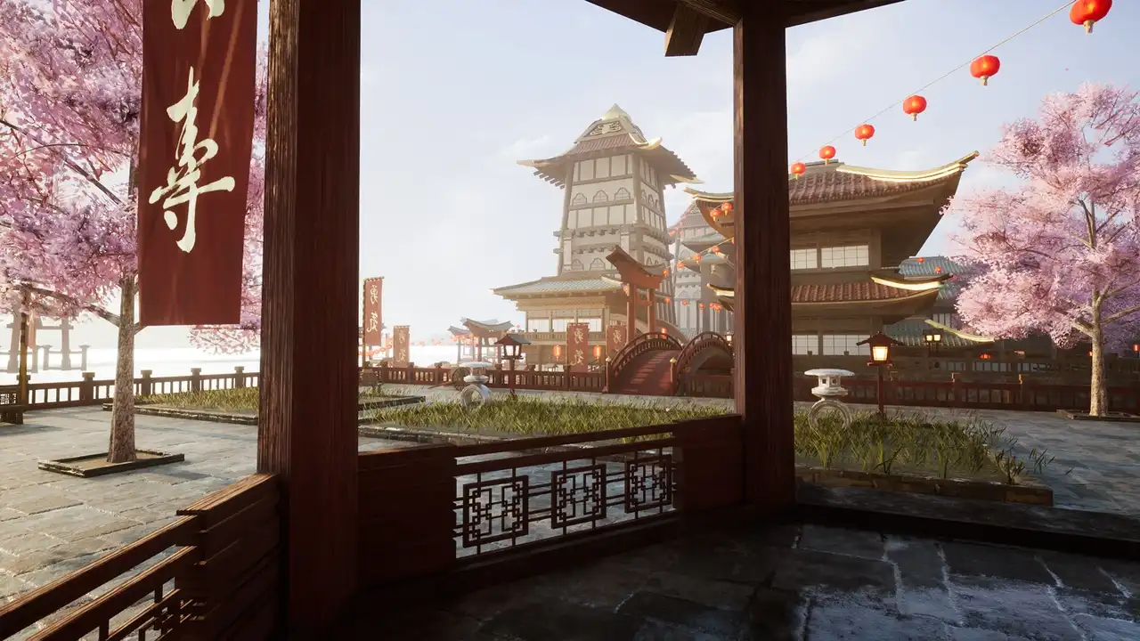 - 模块化拼接系统:墙体、屋顶、地形模块均采用标准化比例(Epic Skeleton Scaling),支持快速搭建复杂城市布局;Spline蓝图系统可一键生成沿路径分布的灯笼链,提升场景叙事效率。