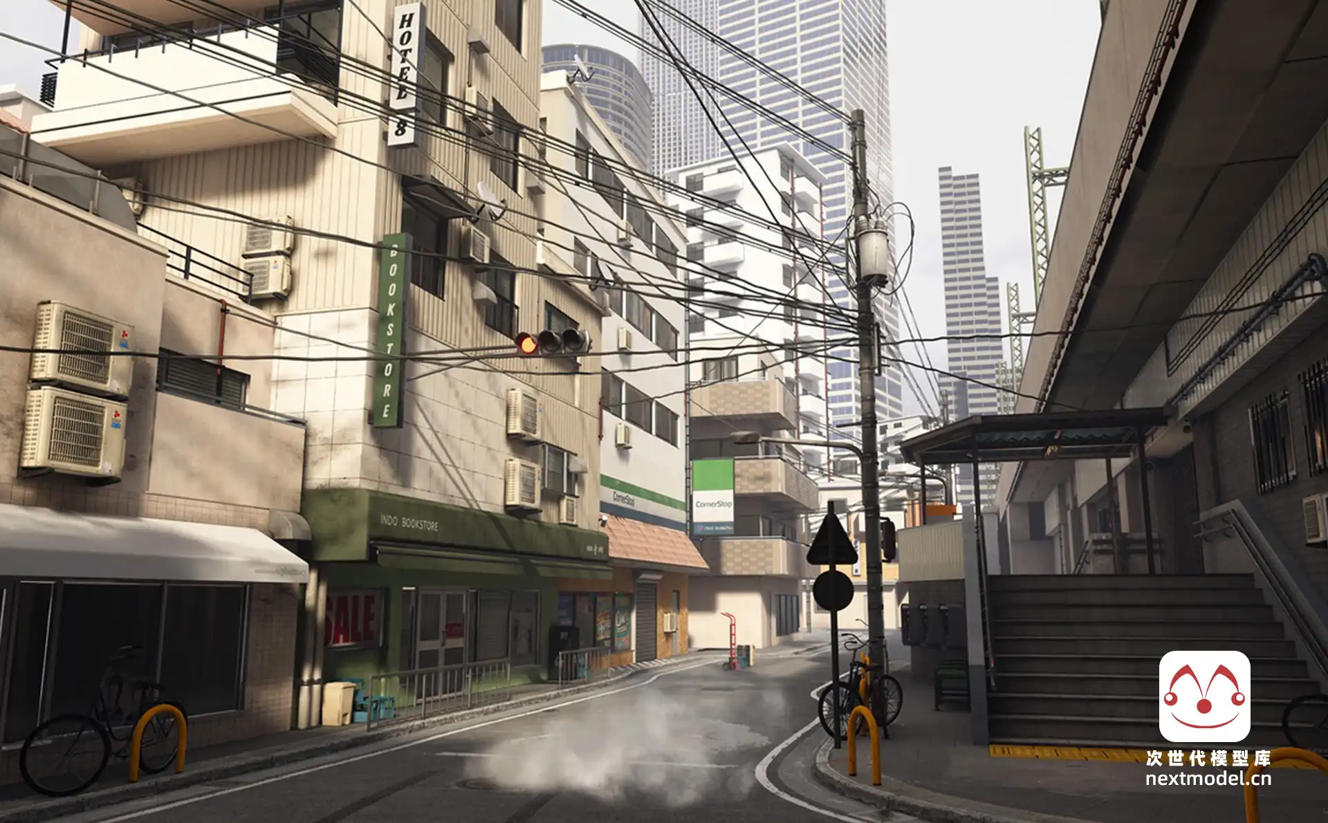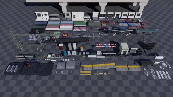 - 80组可定制标志与海报(含商店品牌),通过蓝图参数化调整文本内容,适配赛博朋克、现代都市等多元风格。