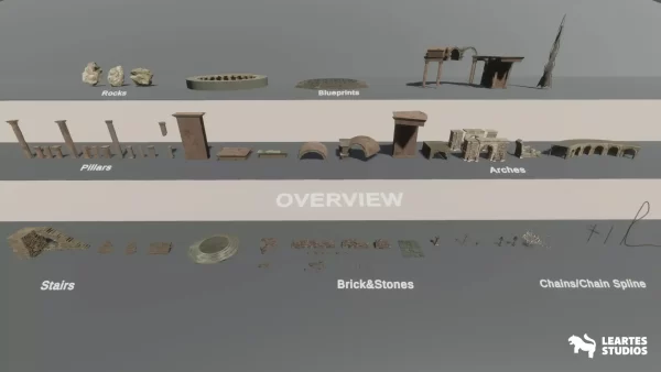 - 所有模型均为游戏就绪(Game Ready),可用于关卡编辑器直接拼接