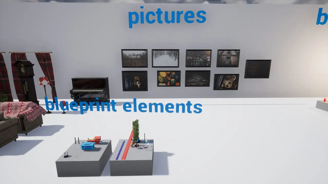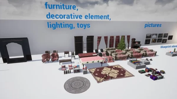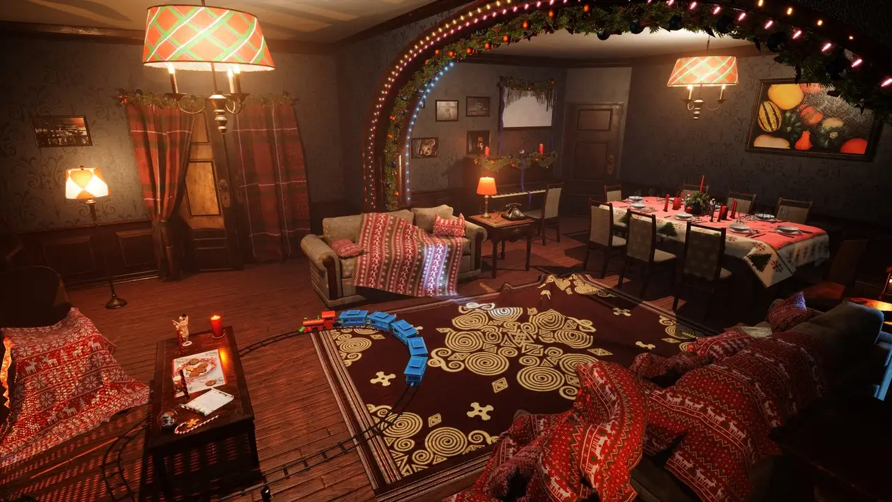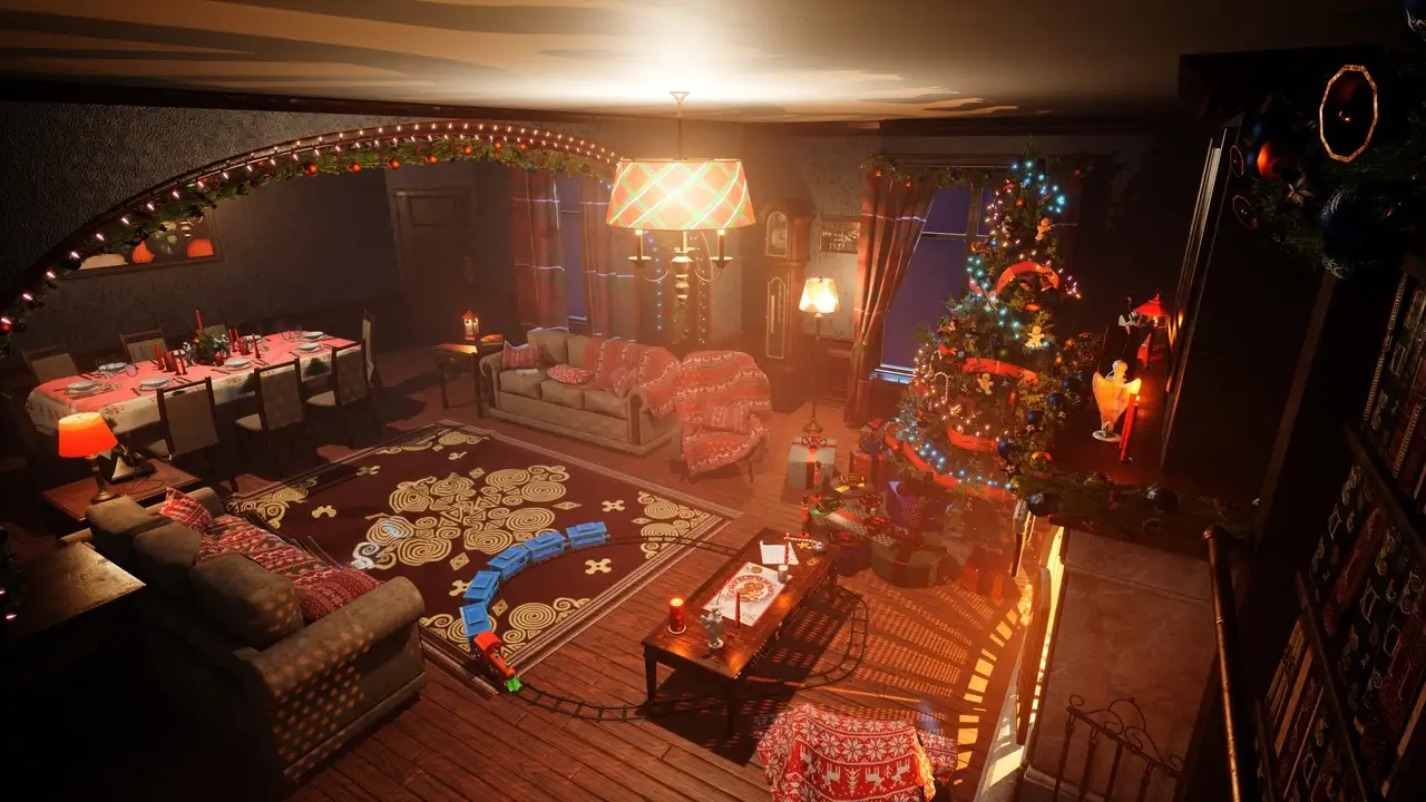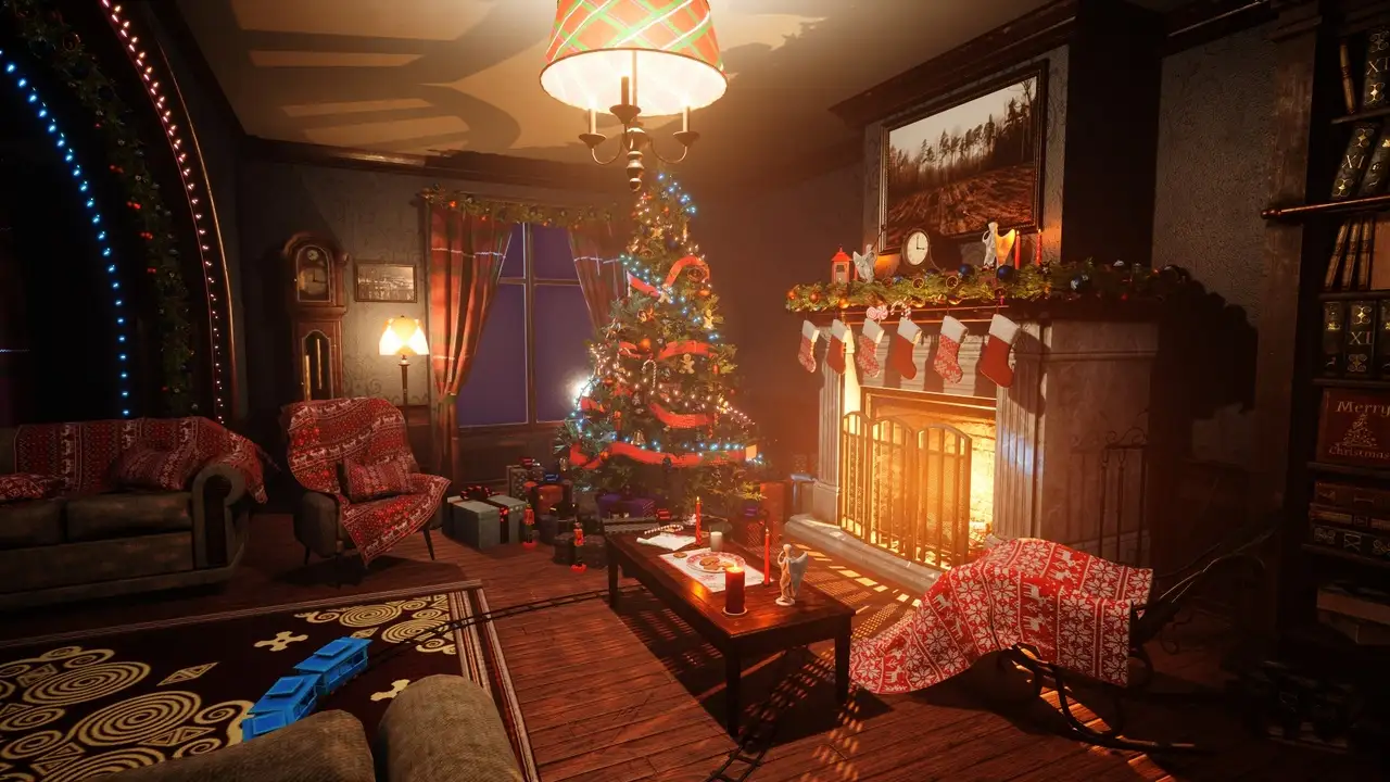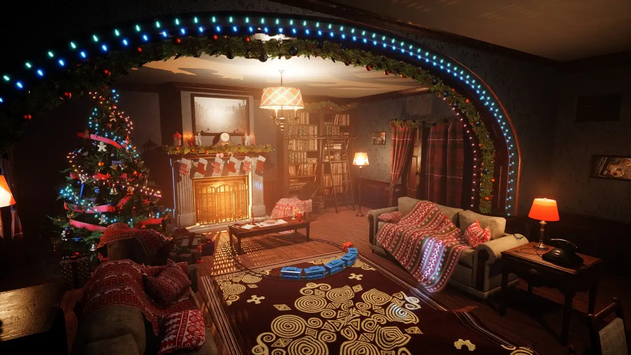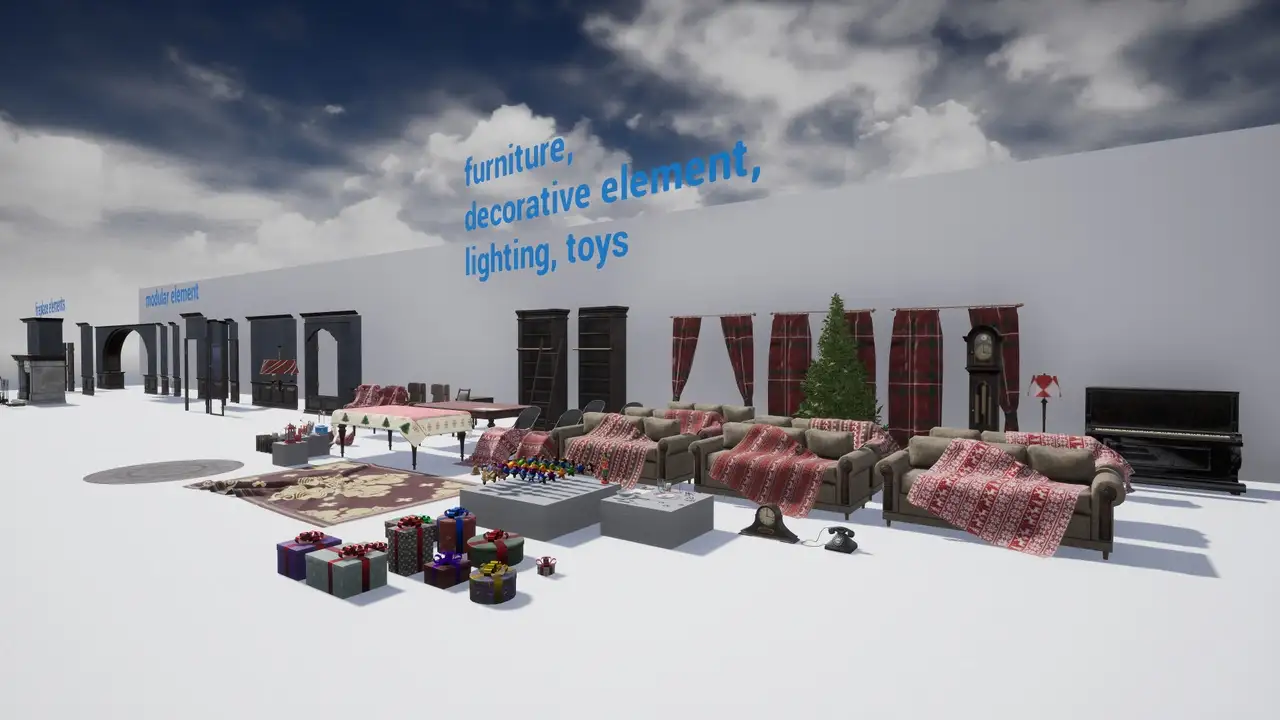 - Spline蓝图应用:内置专为节日特效设计的蓝图系统,支持通过Spline组件自动生成圣诞灯串(garlands)、控制儿童铁路(children's railway)运行路径,并实现灯光辉光(glow of Christmas lights)的动态脉冲效果。