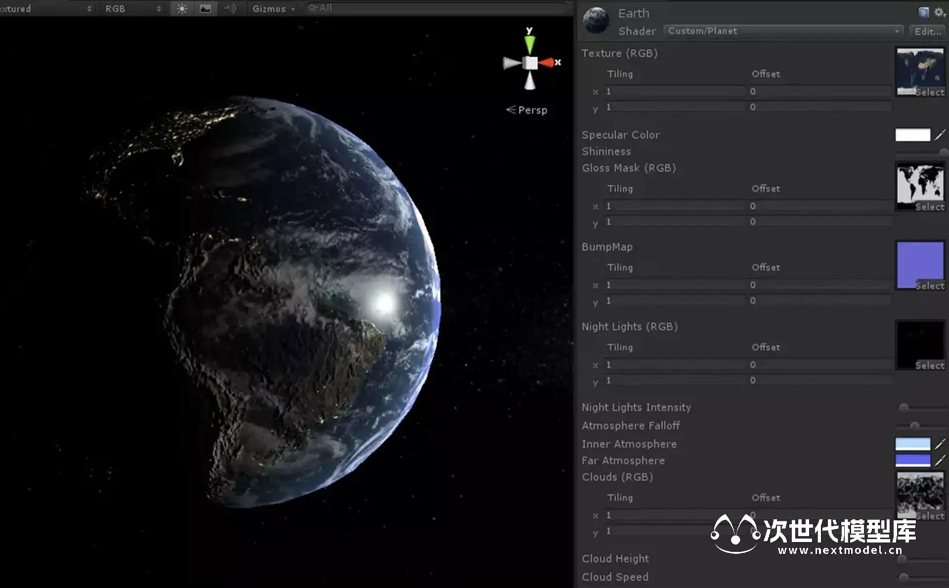 一款高品质的地球模型,该模型具有逼真的地球大气层效果,并配备了能够实现大气层效果的着色器。该模型具有以下特点:大气层内外两种颜色;云层在两个方向上的移动;云层距离地面的高度;夜间照明效果;太阳反射仅出现在被云层遮挡的水面上。