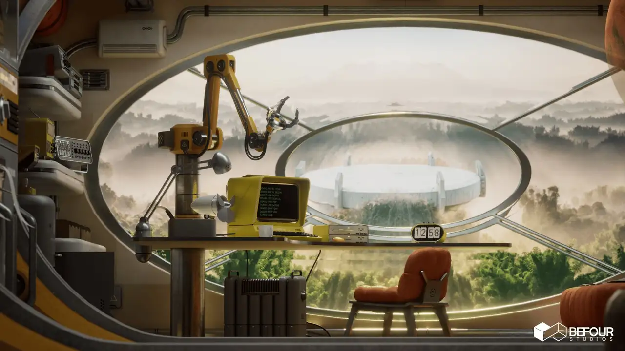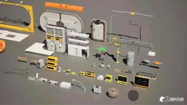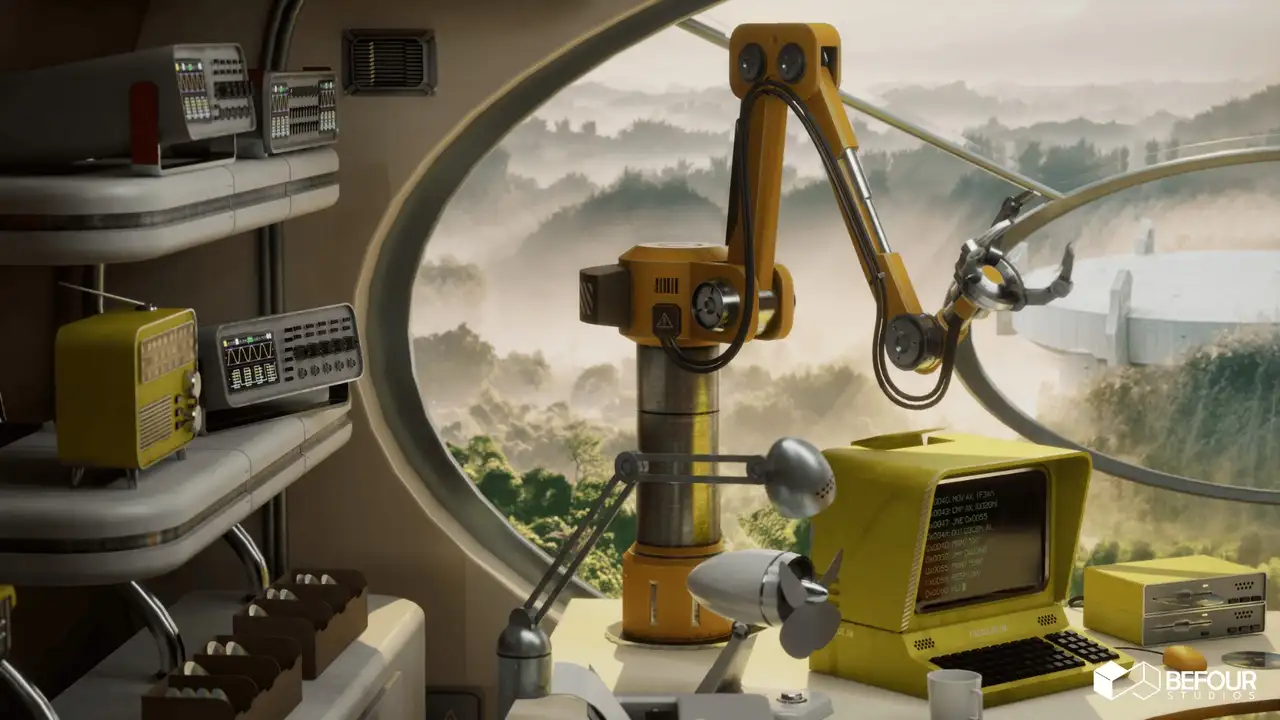 - 设备道具:复古计算机、打印机、示波器、全息投影仪、机械臂、控制台、仪表盘、储物柜;