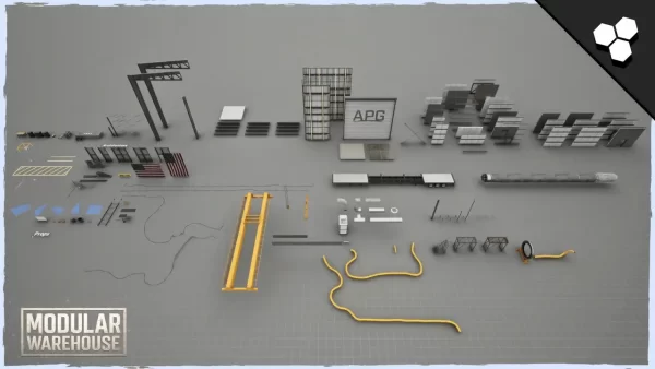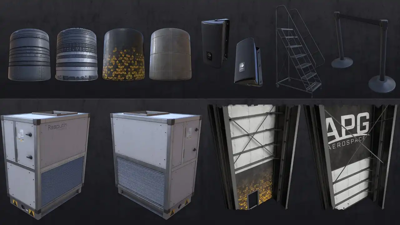 - 大型道具集合:起重机、集装箱、托盘、工具架、工业设备等,可跨项目复用于港口、工地、军事基地等场景。