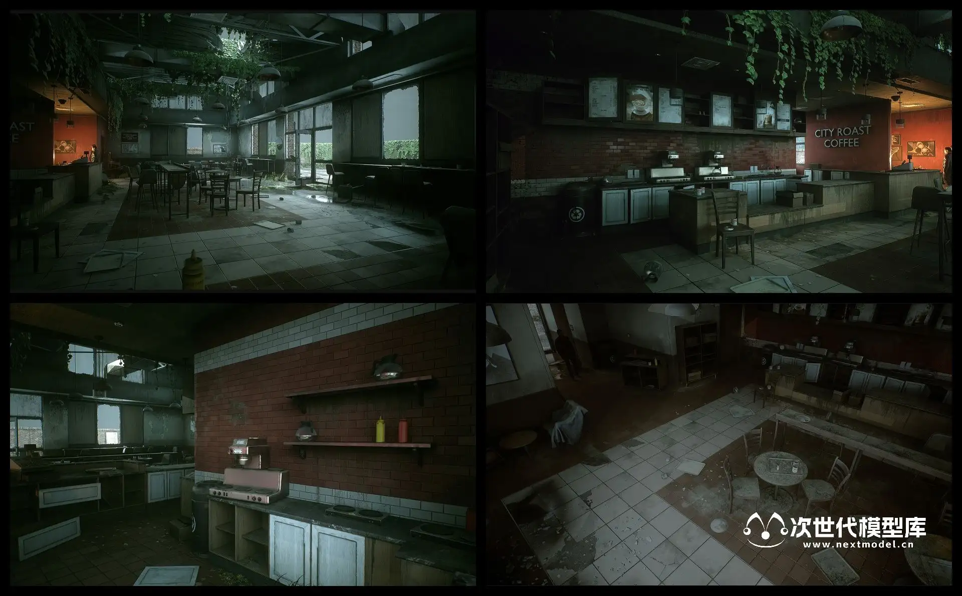 在末日世界的城市背景下,我们为您呈现一个废弃的咖啡店3D素材包。这个素材包的设计理念旨在为用户提供一个高度逼真的AAA级质感视觉效果。咖啡店不仅包括完整的内部结构,还具备超过190个网格资产和310个贴图。